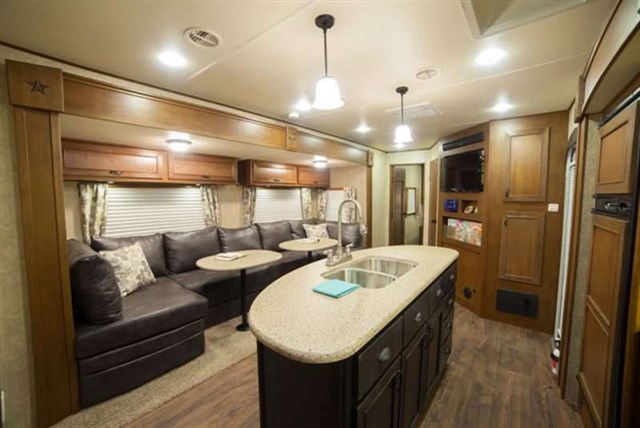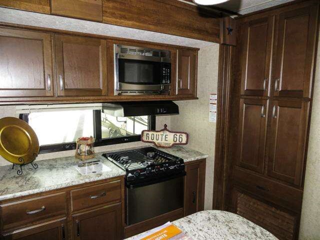 Step inside and see how easy camping with a large crew can be in this spacious unit. You will find the kitchen to the left of the door has everything needed to prepare and cook food. There is a refrigerator, counter space, a three burner range, and microwave within the curb side slide. A pantry for your non-perishables and paper goods is next to the slide out. The kitchen island includes double sinks making it convenient for prep work, storage, and more.