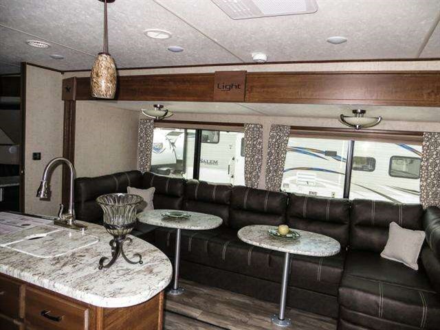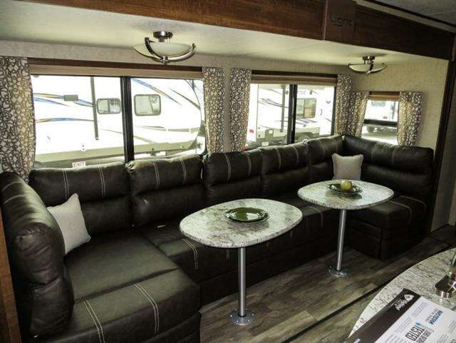 Opposite the door side there is a large slide out u-shaped lounge with queen bed including overhead storage and two dining tables. You will find plenty of space for everyone when it comes to mealtime. Enjoy the entertainment center located across the room on the angled wall of the bathroom.