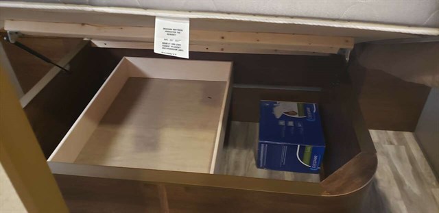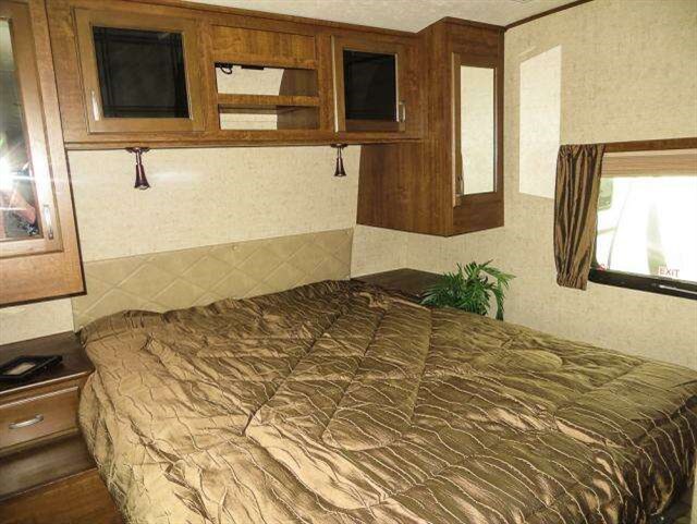 The front bedroom provides a restful retreat with a comfortable queen size bed, nightstands and shirt closets on both sides, plus overhead cabinets for more storage. You will even find a large pass-through compartment on the exterior that is located beneath the front bedroom.