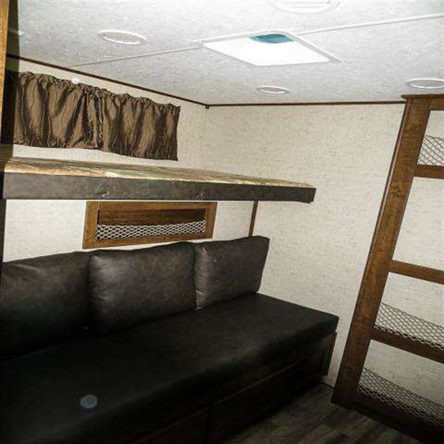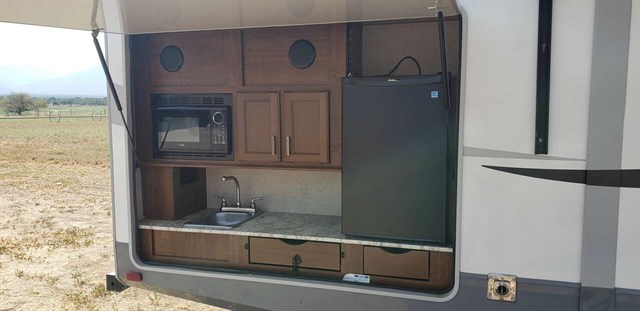 Back to the rear of the unit the bunkhouse is where you will likely find the kids. There is a jack-knife sofa slide with a bunk above on the right, and a set of bunk beds and storage on the left side. There's a TV between the two sides along the rear wall. The outside kitchen is where you will find the outdoor chef in the family, plus there is so much more to see!