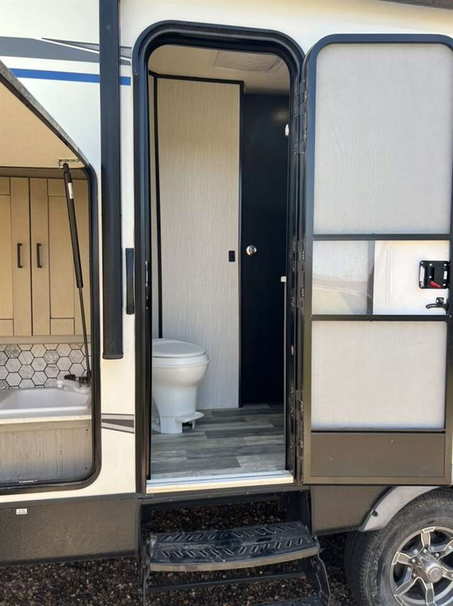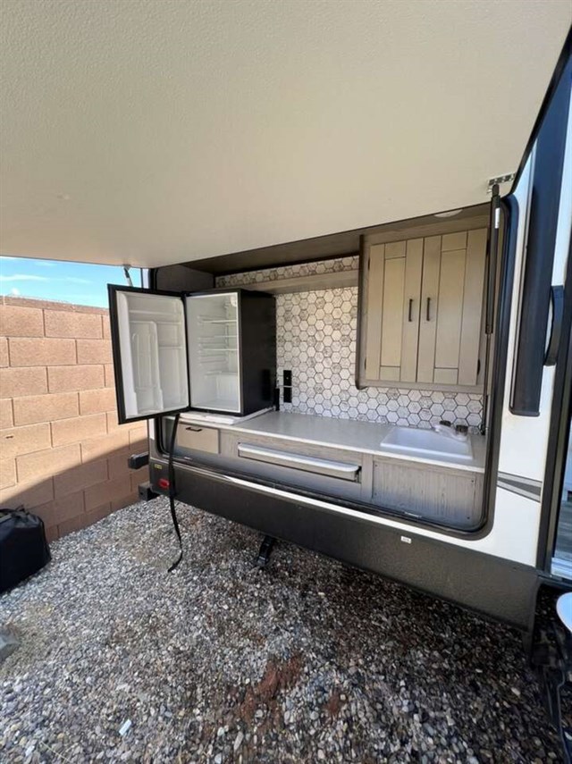 Outdoor kitchen including sink, BBQ set-up, storage, prep area, and more.