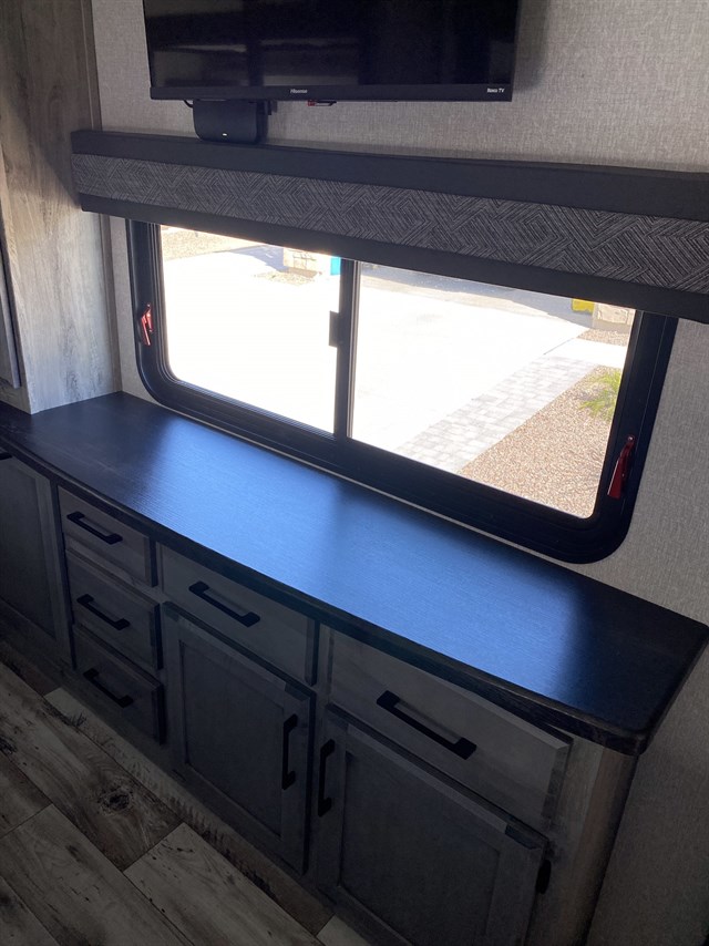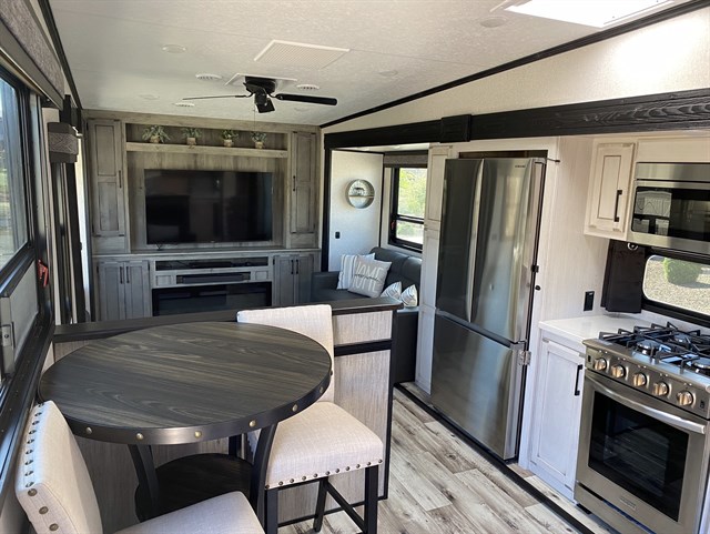 The rear living area of this fifth wheel will be the talk of the campground! It features a rear entertainment center with a 65" smart LED TV and a 48" fireplace, as well as opposing hide-a-bed sofa slides and theater seating with USB charging. The kitchen has everything you need to prepare your best meals including a 24" oven with the four burner range and booth seating with two chairs on the other side to enjoy your meals and play card games. Two can get ready at once in the full bathroom with the dual sink vanity and rinse the sand out of your hair with the 48" x 30" residential shower with a seat. The front private bedroom has a king bed slide across from a dresser with a built-in hamper and a front wardrobe prepped to add an optional washer and dryer. There is even an outside griddle to cook some pancakes for a sunrise breakfast!