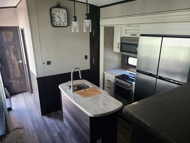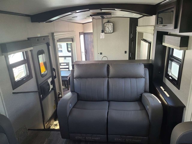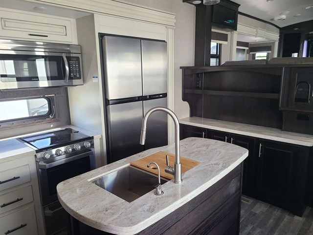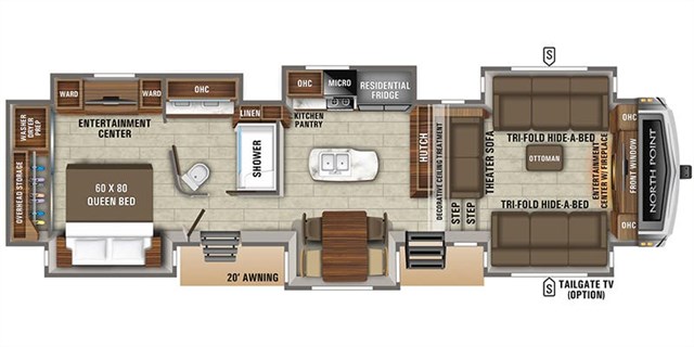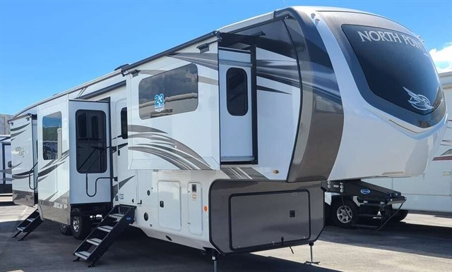 Your family will beg you to take vacation after vacation when you travel in this North Point fifth wheel! As you take in the sights and sounds of beautiful nature during the day, you will appreciate having a relaxing oasis to come home to each night with the private master suite that has a Simmons residential king foam-top mattress in between two built-in nightstands, a walk-in closet, and a 32" LED TV on top of a full-size dresser. Not only is this unit full of exciting features, but it is also full of space thanks to the impressive six slides that have been included. These slides can be controlled by the One Control Digital Command system which allows you to extend each slide with the push of a button, and the central vacuum system allows you to keep your interior free from dirt and fallen food.