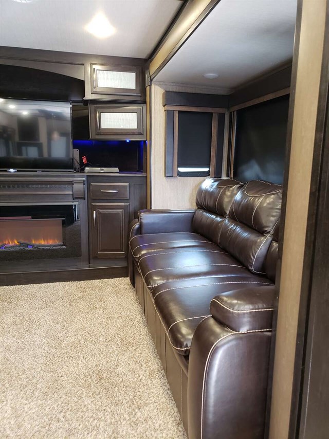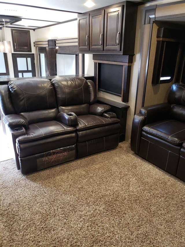 Head up the steps to the raised front living and entertainment area. There is a theater seat for two along the inside wall, or you can choose optional lounge chairs instead. Both slides in front feature a tri-fold sofa which allows for plenty of seating during daytime hours and sleeping when you entertain overnight guests. The front wall offers a telescoping TV with fireplace and overhead cabinets making this a great space to enjoy the company of your family and friends!
