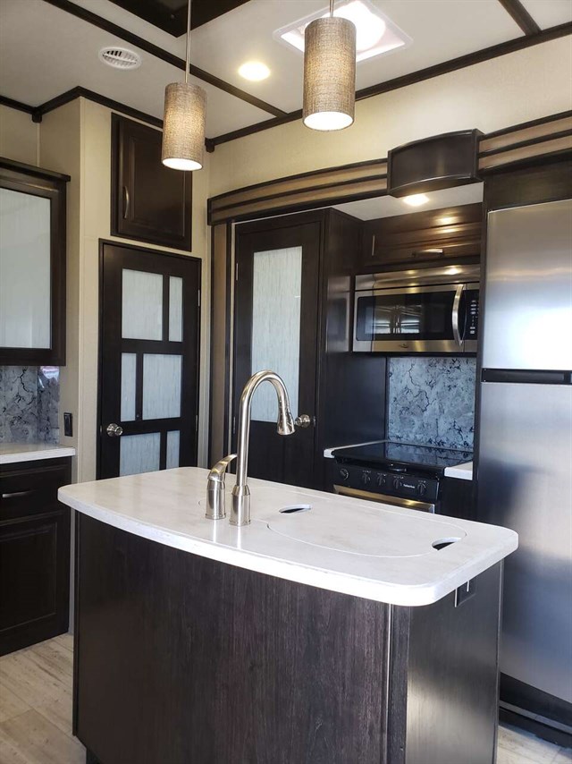 Step down just outside the bathroom into a spacious kitchen and dining area featuring dual opposing slides. There is a free standing dinette found in the curb side slide out. Opposite a second slide features a pantry, a three burner range with overhead microwave oven, and an 18 cu. ft. refrigerator. Adjacent to the pantry find a space that has been prepped for a washer and dryer if you choose to add the appliances. A hutch with more counter space and overhead storage is located along the interior wall just inside the main side entry door. Plus a convenient kitchen island also features a double sink for easy clean up, and more.