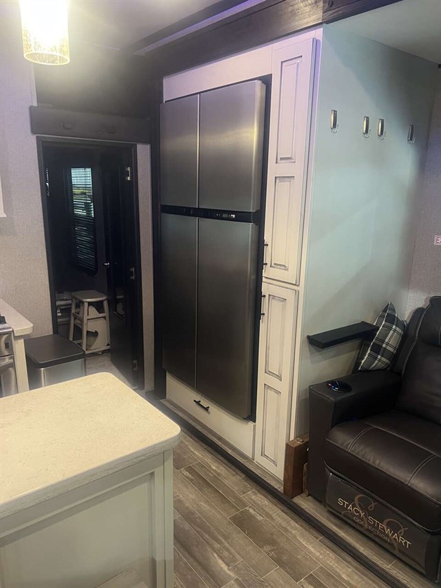 An outside kitchen with a TV, a spacious 13' garage, plus a large walk-through bath are just a few features that make this toy hauler great. The EZ lift tailgate will make for easy unloading, and you can dine at the cargo table once your toys are out. The kids are sure to climb up into the loft to play, and you'll find a half bath here with a fold-away wall for convenience. This model features an L-shaped kitchen with ample counter space, plus a pantry for the snacks. Your guests can relax on the theater seat or L-shaped dinette and watch a movie on the 50" retractable TV if it's raining outside, and everyone can freshen up in the full bath that includes a walk-in shower with a seat for comfort. This model also includes a front master bedroom with a walk-around queen bed, a wardrobe slide, plus a 40" TV to watch the news in bed!