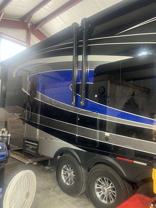 With each Seismic toy hauler by Jayco you will appreciate the 5-Star Handling Package which includes MORryde CRE-3000 rubberized suspension, 7,000 lb. Dexter axles with Nev-R-Adjust brakes, plus Goodyear Endurance tires for smooth towing wherever the road takes you. The equalizer hydraulic 6-point auto-leveling system, LED high-intensity ramp lights, and fully enclosed, LED-lit Nautilus universal docking center will make set-up a breeze once you arrive at your destination. These toy haulers feature Shaw vinyl flooring, solid hardwood slide fascia, a stainless steel sink, plus many more interior comforts to make you feel right at home. The central vacuum system will easily clean up the dirt from your afternoon ride, and the dual USB charging ports will allow you to charge your tablet or phone with ease. For luxury camping with your favorite ride-on toys, this Seismic toy hauler by Jayco is the way to go!