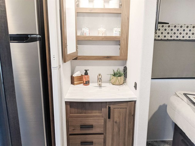 This is a 2021 Forest River Forester 2501 with all the high-tech features to make driving this new vehicle a breeze. Don’t be fooled by the small exterior – this 27’ RV has three slides that make it feel more like a 30’ RV when setup. With a separate master bedroom, queen over cab, and u-shaped dinette that turns into a third bed, you can easily sleep 4-6 adults comfortably. The master bedroom includes a queen bed, LARGE wardrobe with 6 drawers, TV, and solid privacy door (not a curtain!). The cab over queen has a 40” TV on a swivel for watching your favorite shows or popping some popcorn and closing the curtain to create a cozy movie-theater experience (kid favorite). The large U-dinette is complimented by swivel front and driver passenger seats for additional seating. The curved kitchen with expansion leaf provides plenty of counterspace for cooking meals. The extra capacity 12 volt 10.2 CU fridge and freezer and pantry offer tons of storage for your food.