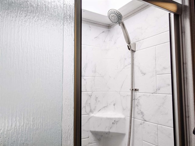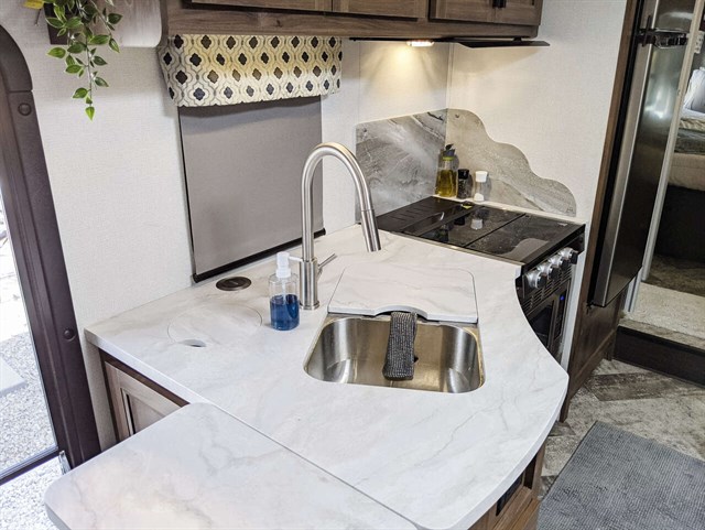 The RV is fully loaded with top of the line exterior amenities too, including an outdoor TV, surround sound speakers inside and out, an outdoor shower, plenty of storage. Combine this with a large 18’ awning and you’ve got a perfect space for your whole crew.