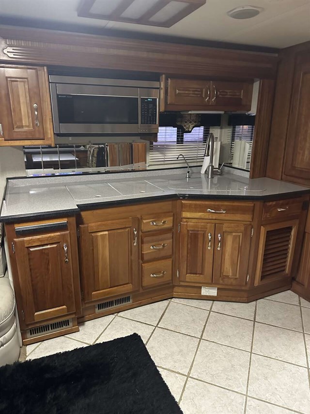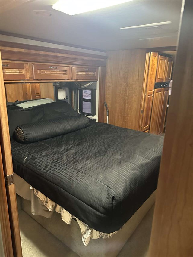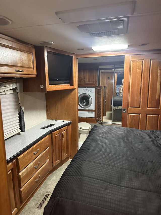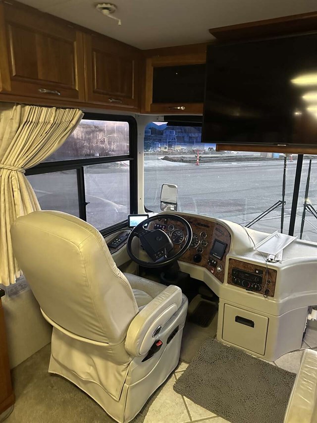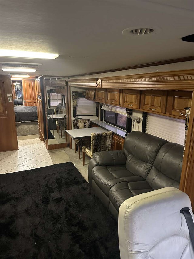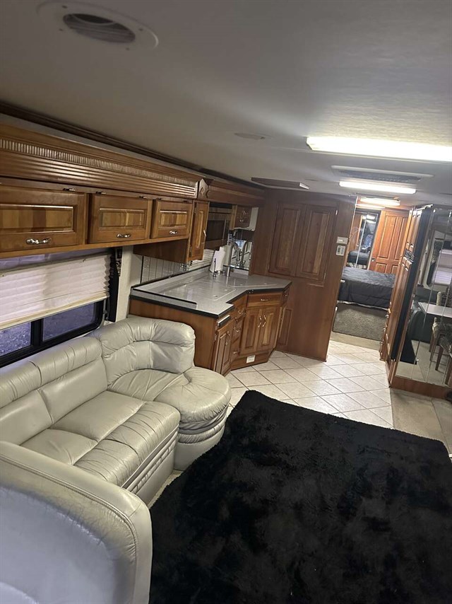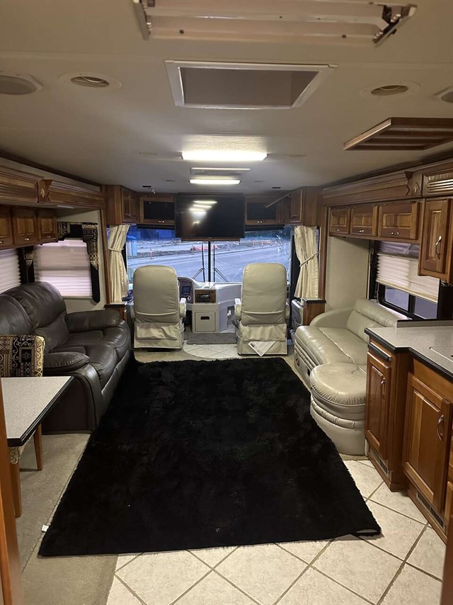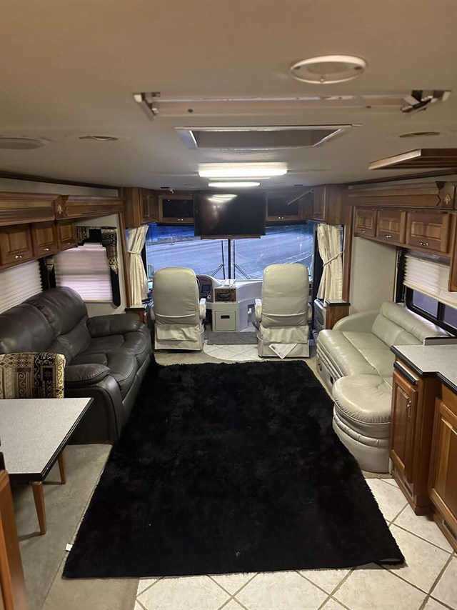 This luxury 40 ft Class liter Cummins ISC Turbo 6 cyl 350 HP Allison 6 speed, Roadmaster RR8S chassis, 8 air bag suspension, side radiator (great maintenance access), 4 hyd jack leveling, front and rear ducted AC, dual propane furnaces, propane/electric water heater. 3 slide, queen rear bed room, Cherry wood panels, tile floor, convection/microwave oven, two burner propane stove top, Norcold 4 door refrigerator/freezer. Non smoker owner - glass shower, original leather jack knife sofa pull out sofa to double bed (sleeps 5 or 6), table and 4 chair dinette, flat screen TVs front & rear, Onan 7.5kw generator with low hours and much more!