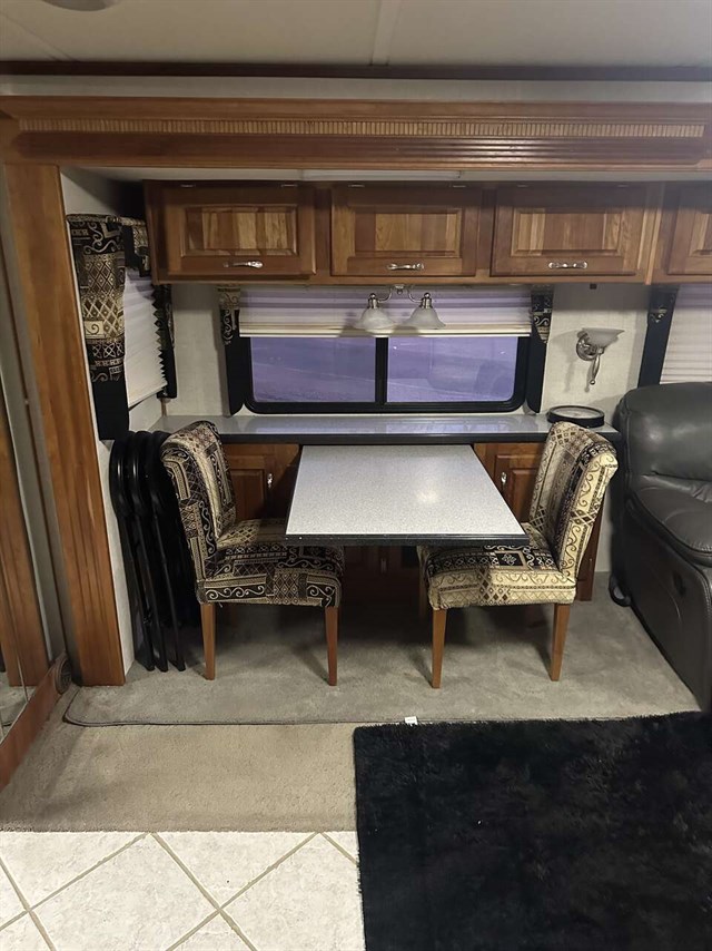 Unique spacious floor plan with 3 slide outs. 1 1/2 baths, large master bedroom with tub/shower, built in dresser & double closet. Main area has 2 fold out beds. Solid wood cabinets, tile flooring, double sided fridge, stereo system with TV's, Exterior has power awning, spray off shower,brand new tires & batteries. Motivated to sell call the phone number below.