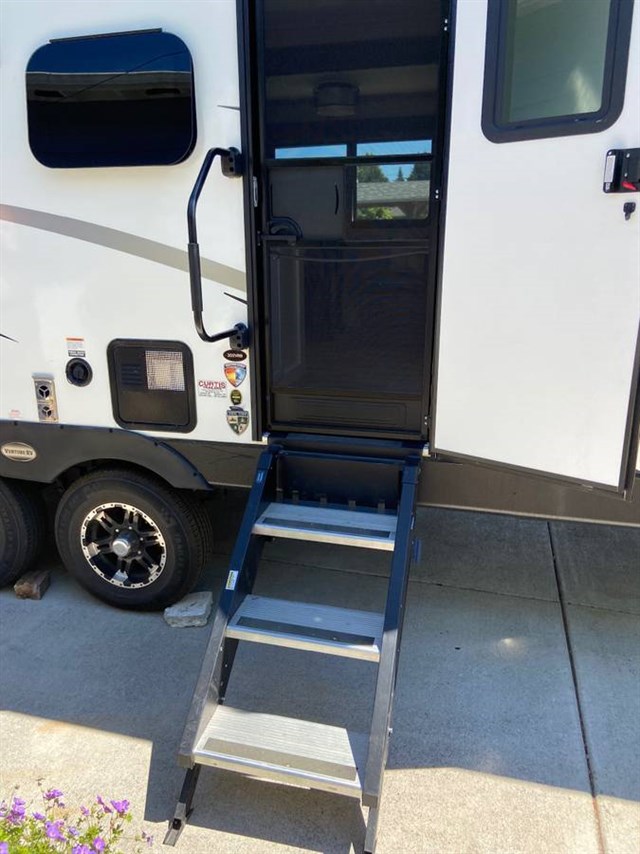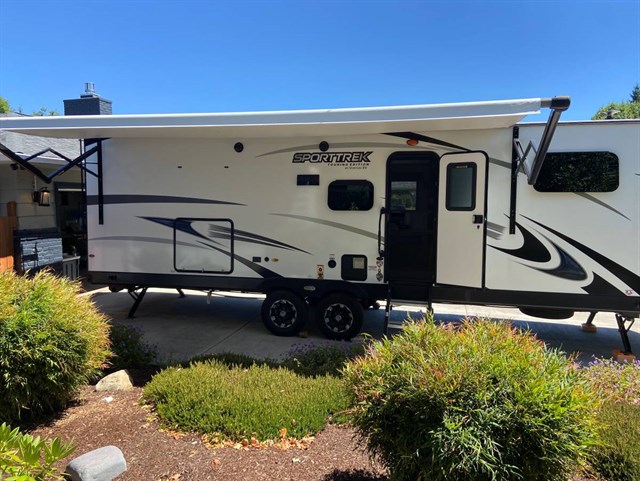 Selling a Venture RV SportTrek Touring Edition STT302VRB. This self contained, 33’ travel trailer comfortably sleeps 4 and features an awning and two slide outs.
