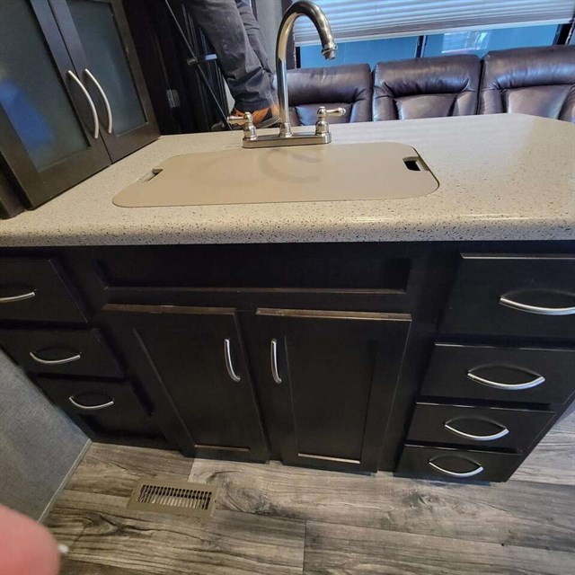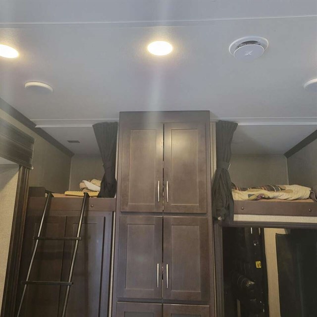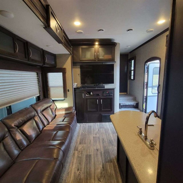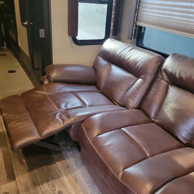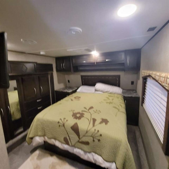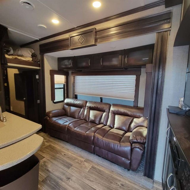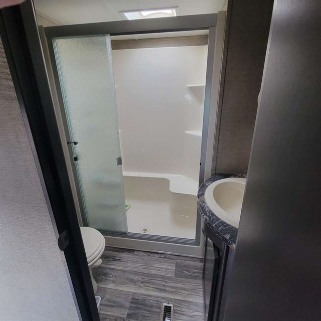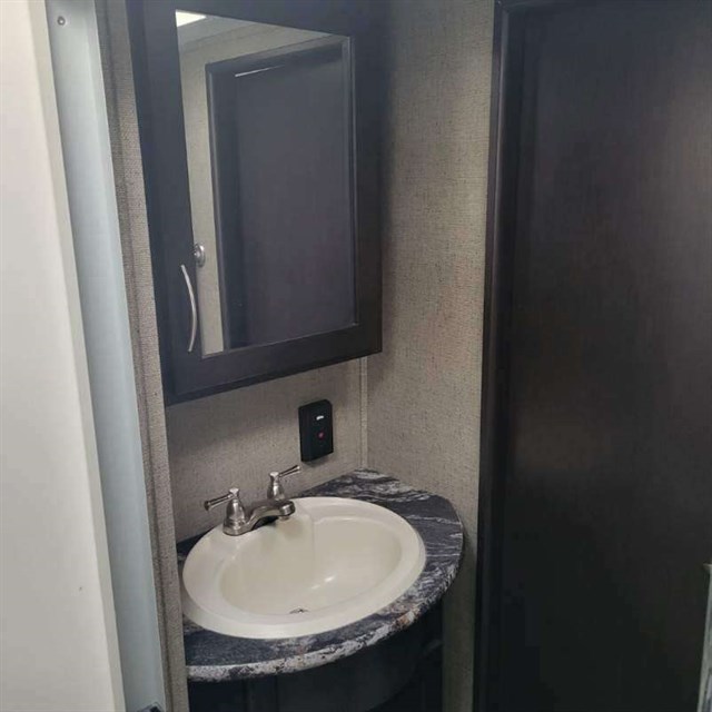 The cook of the family will absolutely LOVE this Carbon kitchen! There is a 12 cu. ft. refrigerator for your perishables, extra counter space, a double sink, and a three burner range. You will be able to prep meals and cook them here, and then you can enjoy the meals on the 97" sofa that has a dinette table in front of it. You will love how much space is in this living area with the dual opposing slide outs! This model also has a loft with a twin bed which I am sure the kids will fight over! Don't worry though because there is an electric bed in the back with dual opposing sofas that fold down into a couple of sleeping space as well, which as just as cool as the loft. Mom and dad will have the private front bedroom and the queen bed all to themselves, plus there is a private entry into the bathroom for convenience.