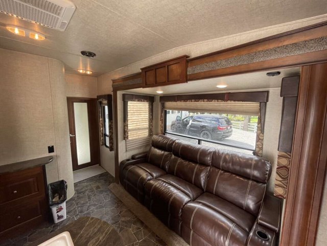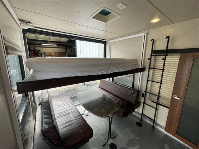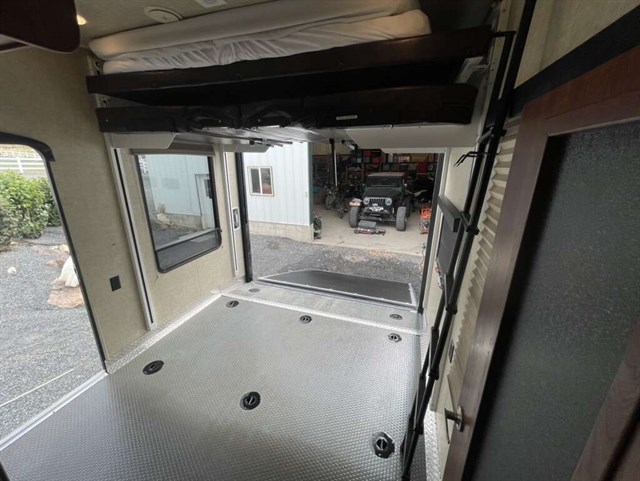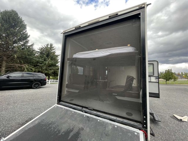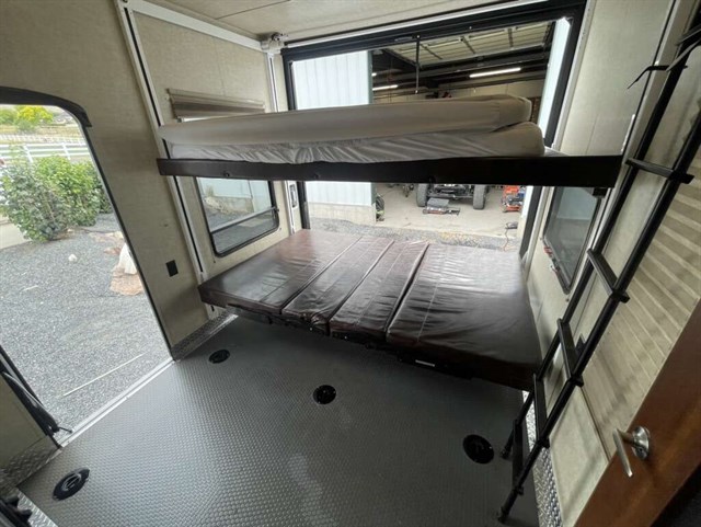 Step inside the rear 10' garage space and see how easy it will be to travel with a few toys. The 8' garage door will make loading and unloading a breeze. Once the rear door is closed you still have access to the cargo area from the outside using the side man door. There is an overhead cabinet for storage and two sofas opposite one another with a top queen bed for use when the cargo is removed.
