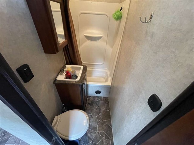 Move into the main living area through the interior man door, or from the second side exterior door. There is a bath on your right coming from the cargo area which includes a tub/shower, toilet, and sink.