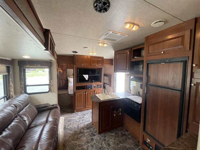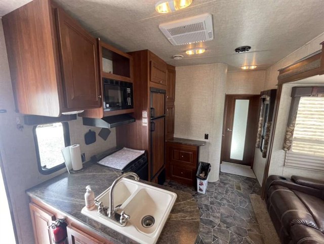 The kitchen and living room space features a large slide out sofa with dinette. There is a counter area with overhead cabinets, a refrigerator, three burner range, double kitchen sink for easy cleanup, and more overhead storage for dishes and things.