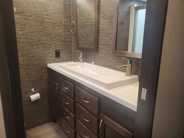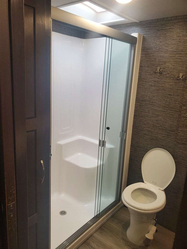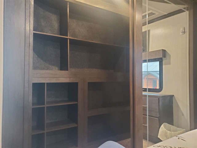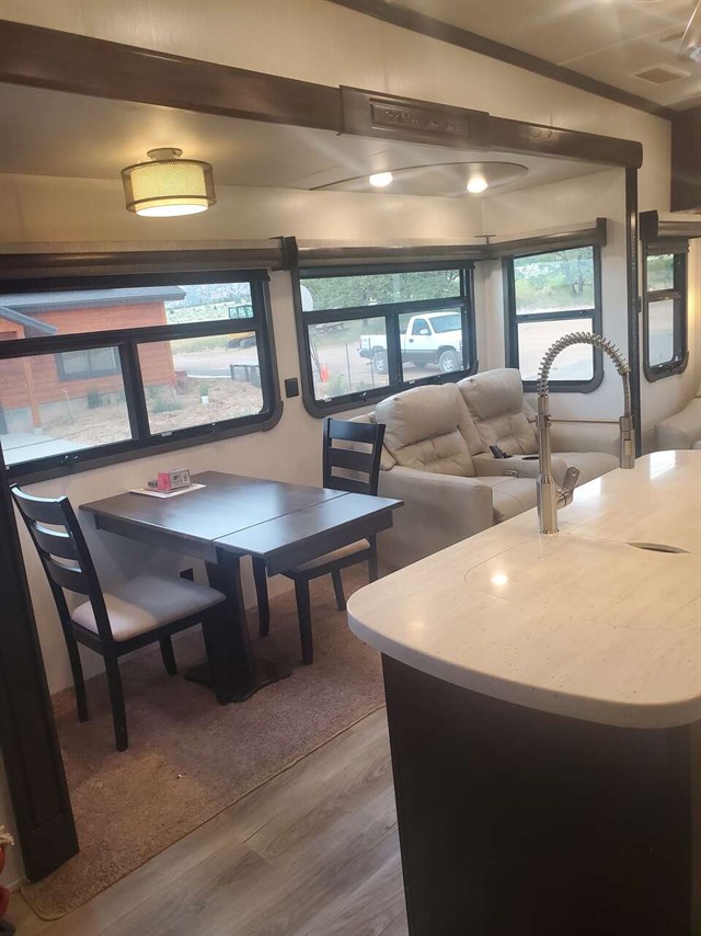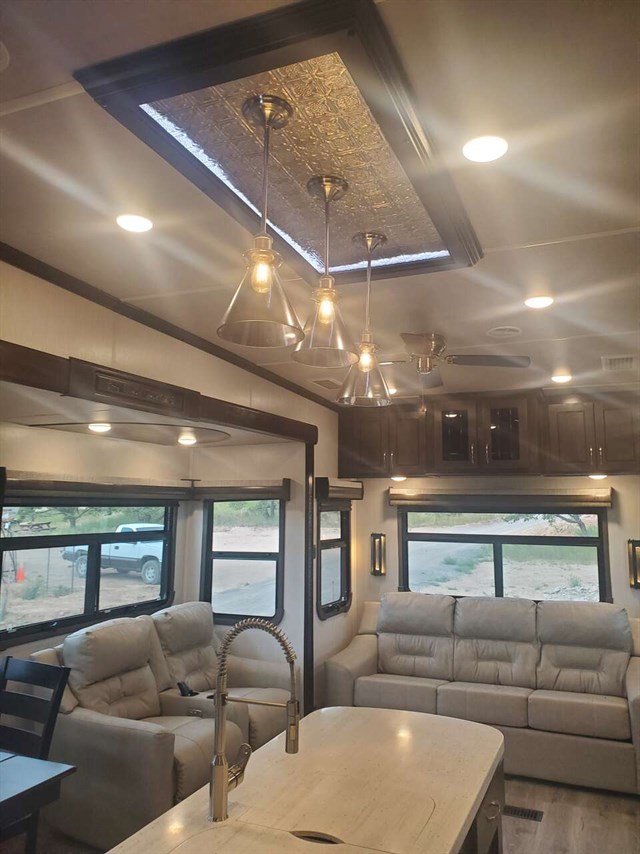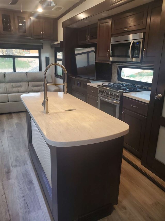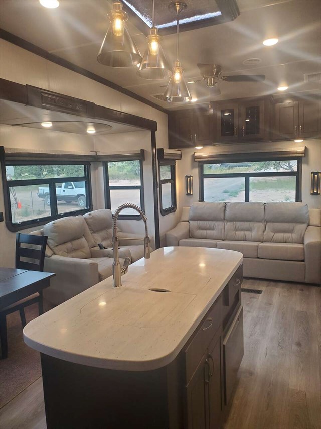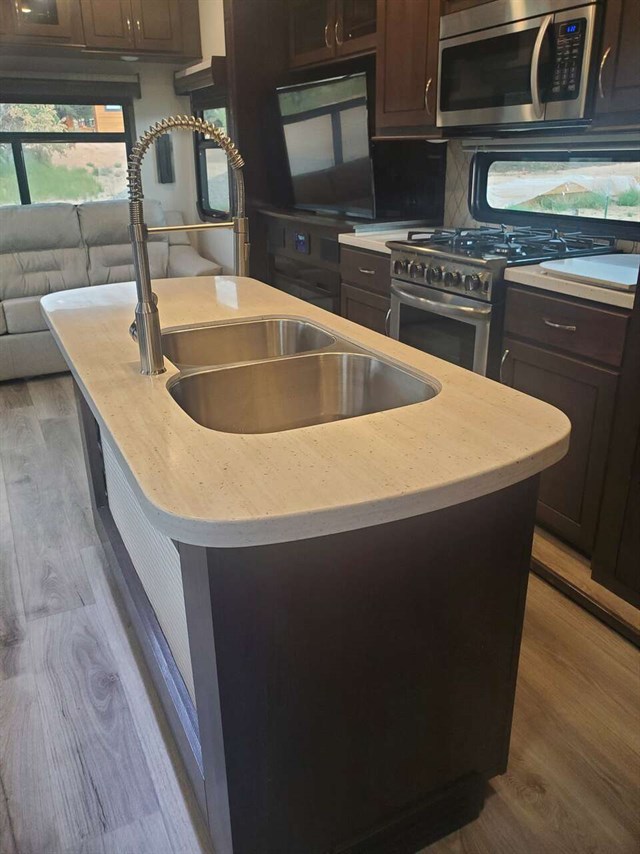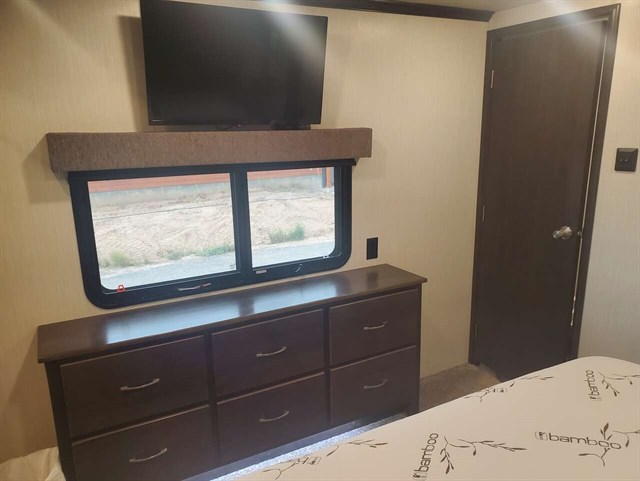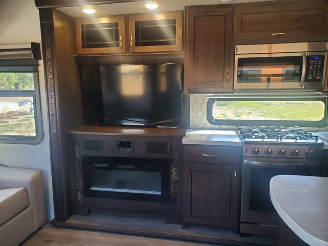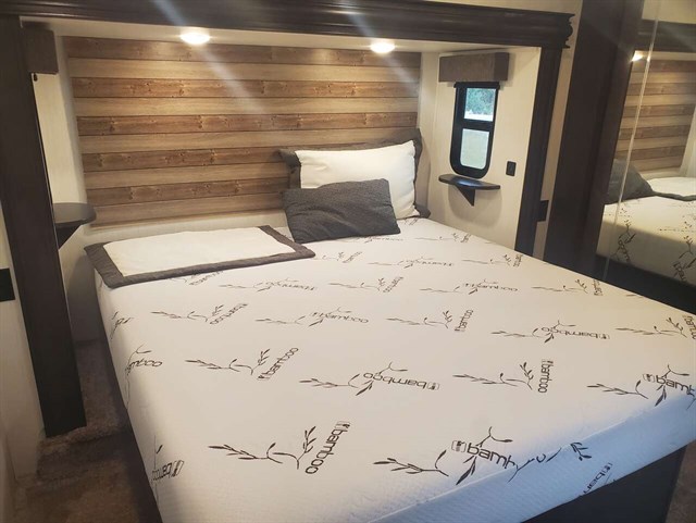 The kitchen is centrally located so you can make snacks and meals while visiting with everyone in the rear living area. Your family and guests can choose to relax on the hide-a-bed sofa, the power theater seats, or the four chairs around the free standing dinette. They can also enjoy the fireplace, the entertainment center and the 50" TV on a swing arm. You can cook in the full kitchen with lots of counter space, and a dishwasher. When you are ready to call it a night, you can head to the master bedroom with a residential style headboard and luxurious bedding decor, USB plug-ins on each side of the king bed, and plenty of storage.