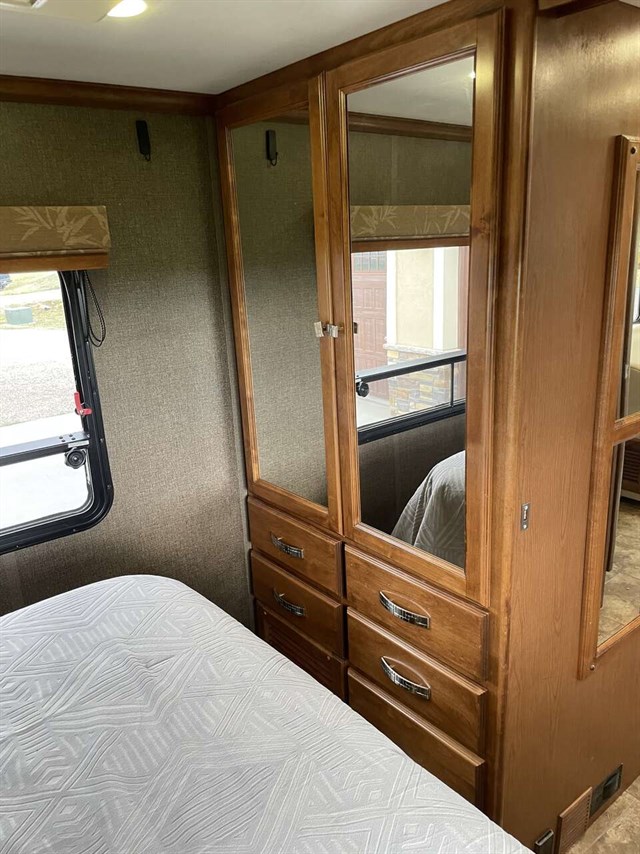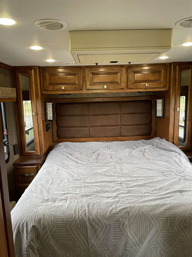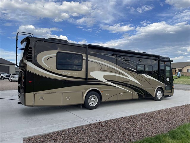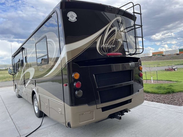2014 Tiffin Allegro Breeze 32BR with 2 slides and only 46,00 miles. This RV is approximately 32 feet in length with a Maxforce 7 engine, Power Glide chassis, 6KW Onan generator with low hours, power patio and door awnings, slide-out room toppers, gas/electric water heater, pass-thru storage with side swing baggage doors, aluminum wheels, automatic air leveling system, color 3 camera monitoring system, exterior entertainment center, inverter, solid surface counters, memory foam mattress, 2 ducted roof A/Cs with heat pump and 1 flat panel TV.