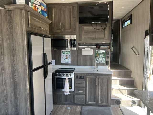 Whether you love to take some dirt bikes out on the trails, hit the lake with a couple of kayaks, or spend the winter snowmobiling throughout the slopes, the Vortex toy hauler from Genesis Supreme will give you the space you need to bring your favorite toys along with you! An exterior awning with LED lights will provide an additional space for you to party with friends, and the AM/FM/CD/DVD stereo with Bluetooth and USB will give you a chance to get that party started. The interior crown molding creates a beautiful space where you can spend your getaways, and the LED lighting will create plenty of illumination whenever you need it.