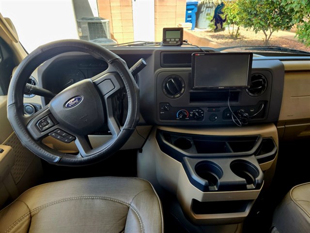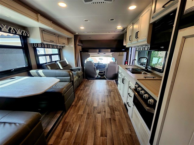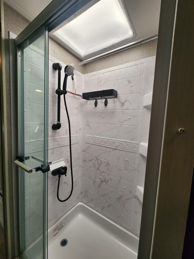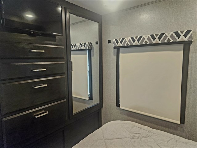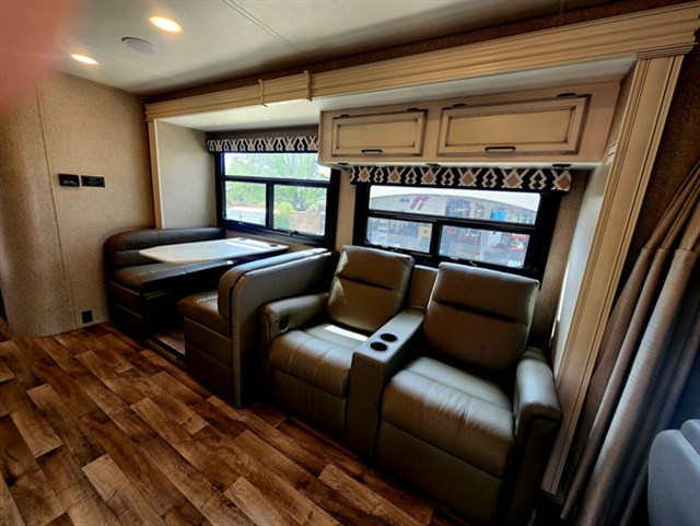 A privacy door separates the 36" glass enclosed shower with an overhead skylight and the bathroom has plenty of cabinet and storage space. The slide master bedroom has dual mirrored wardrobes and built in dresser drawers. The overhead cabinets provide additional storage space and dawn reading lights above the full walk around queen mattress. There is also additional storage capability inside above the theater seats, above the cab, and under the dinette seats.