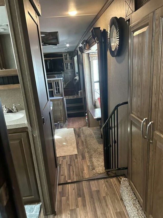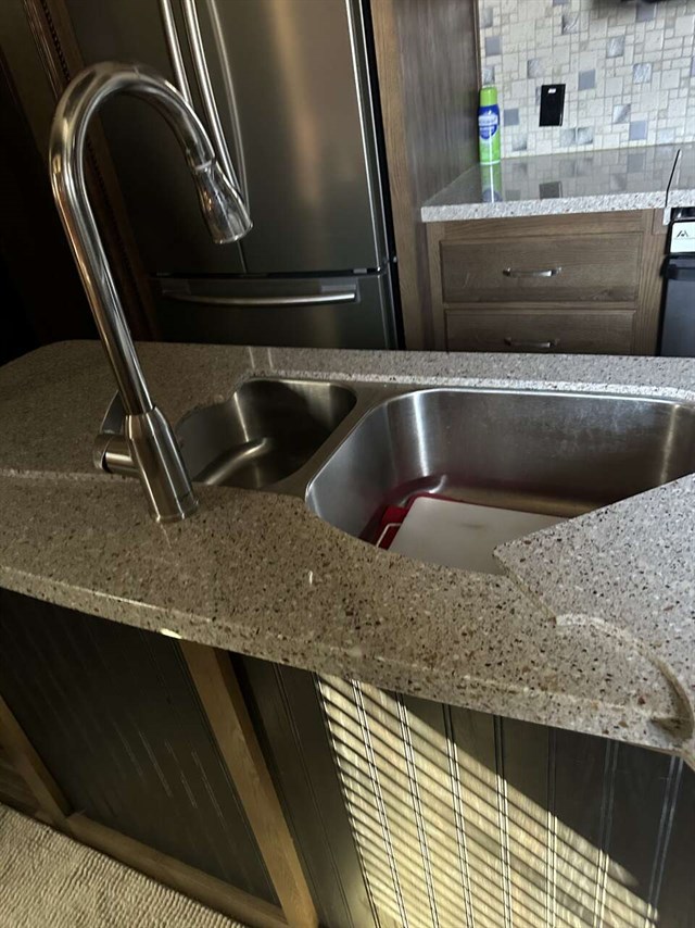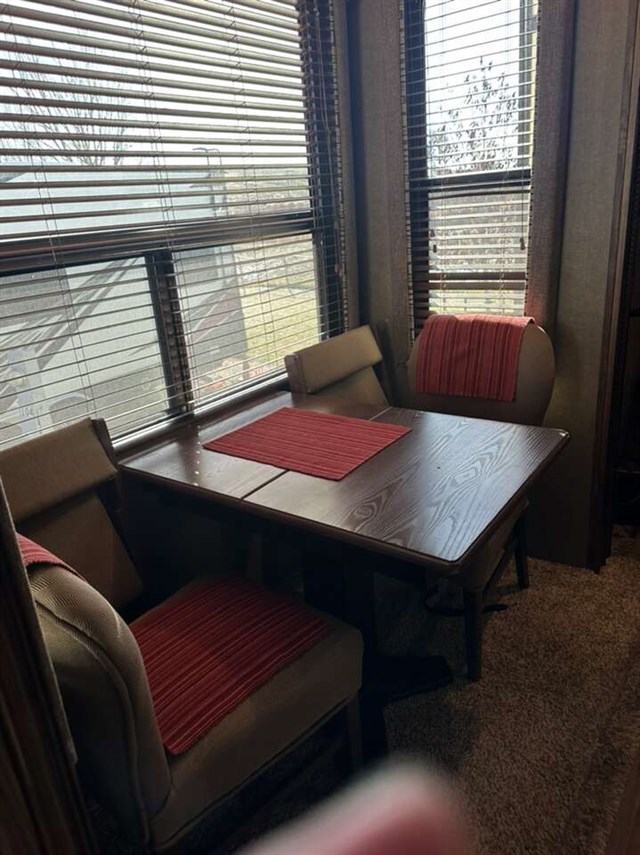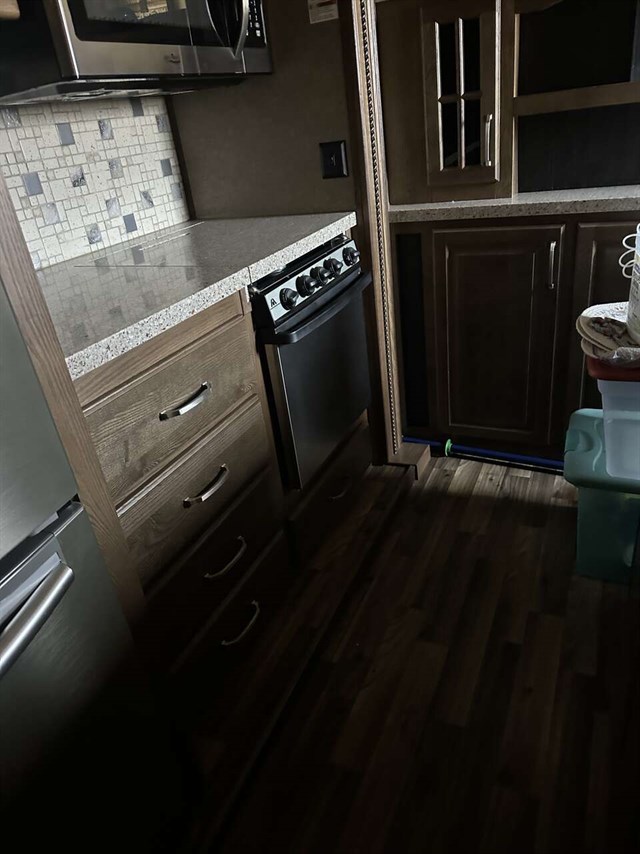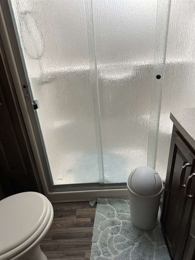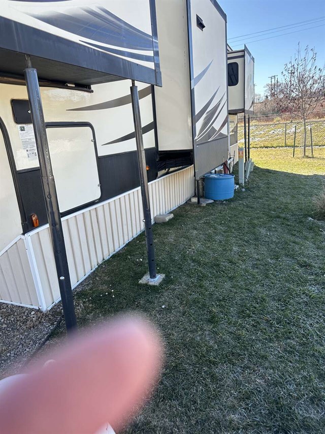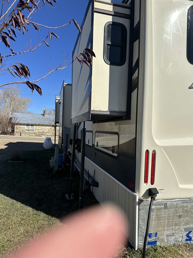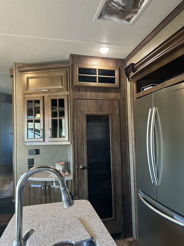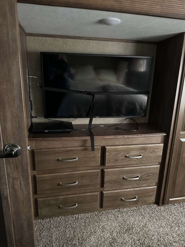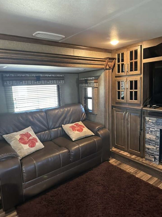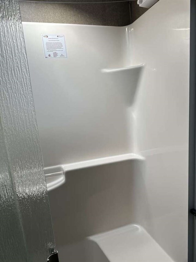 Convectional/microwave / 3 burner gas stove dining table that seats 4 pantry. Step up bathroom full shower with sliding glass doors. Washer/dryer combo magic chief. Bedroom with new Serta mattress tv 2 wardrobes closets. Shirted jacks on all 6 slides winterized on rented space. Can be moved. No warranty buy as is.