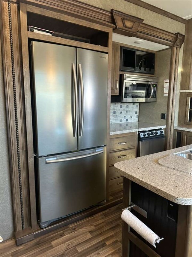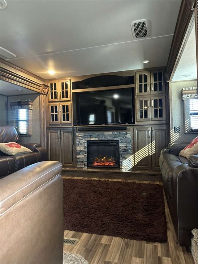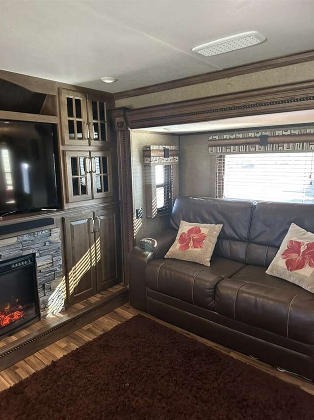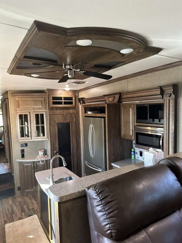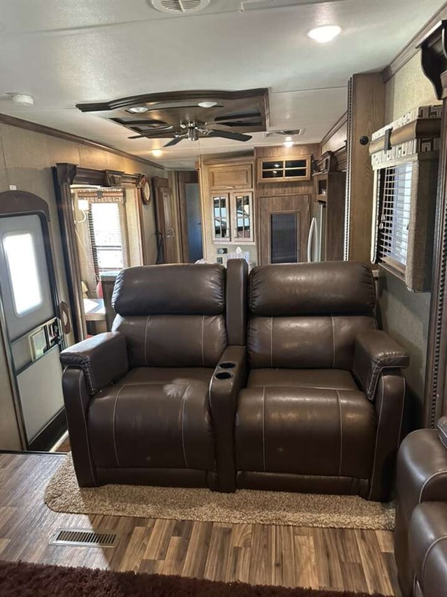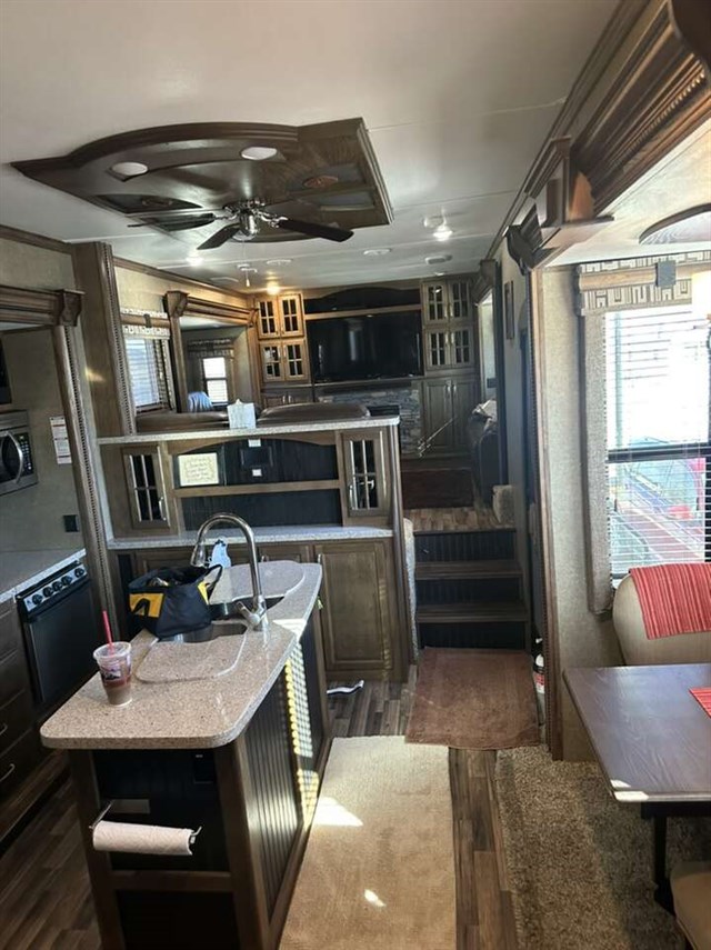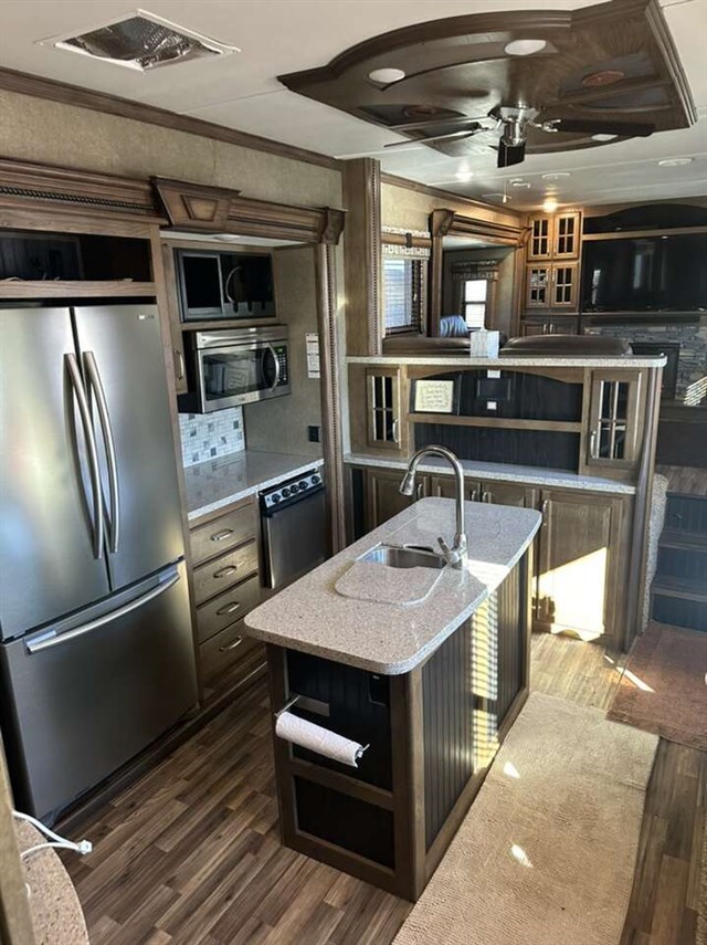 3661FL 2017 6 slides step up living area with sound box fireplace 50 inch tv theatre recliners 2 fold out couches. Kitchen with deluxe Cupboards with stainless appliances granite counter top