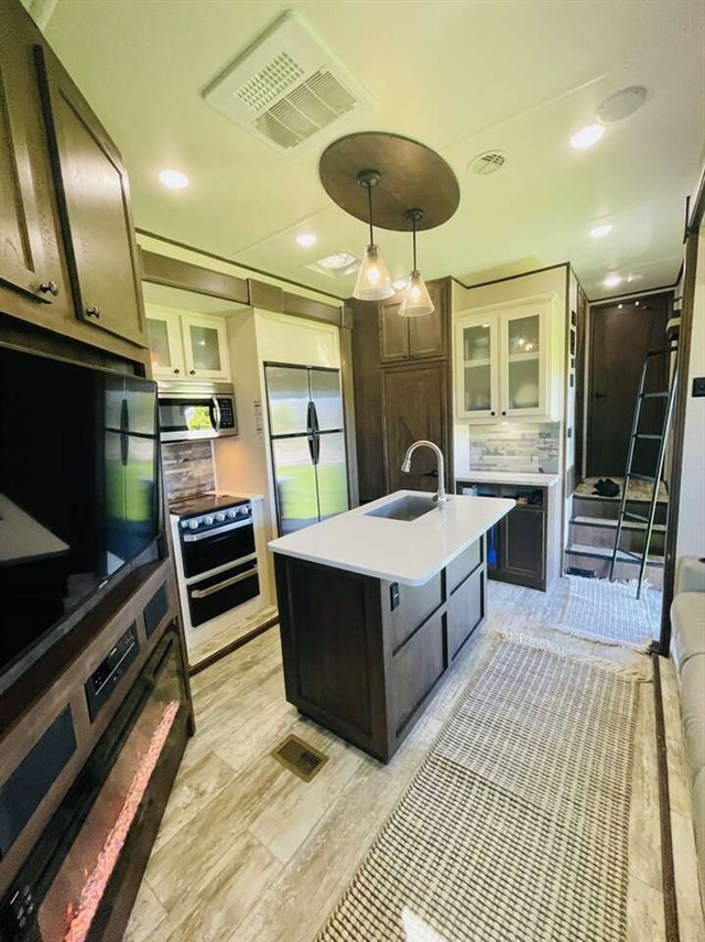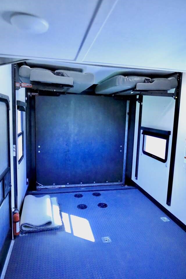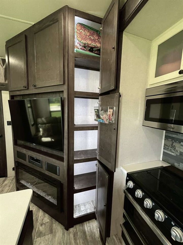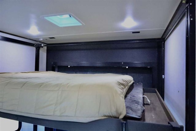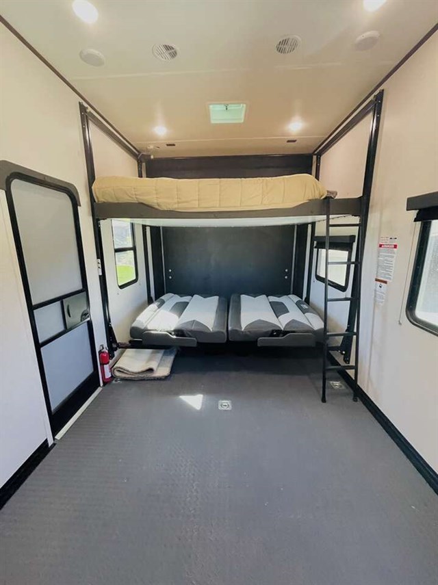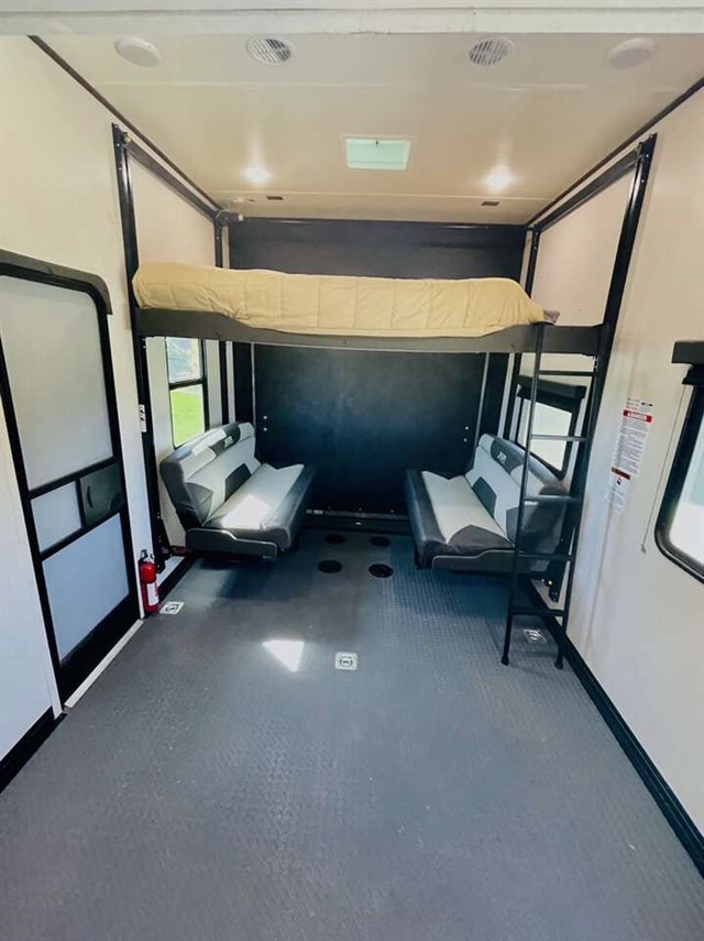 How does a 15' separate garage area with an electric queen bed including sofas and tables below, a side man door, a half bath and storage for your gear sound in your next toy hauler fifth wheel? Get ready for action, relaxation and everything else at your favorite campsite. You can easily set up the triple slide outs, unload your toys and enjoy the garage or the separate main living and kitchen area which includes two slides, a larger sofa, an electric fireplace with 50" TV above for entertainment, plus a kitchen island with seating. The cook will love the appliances including the pantry plus the residential refrigerator and microwave to keep everyone fed. You will have a full bathroom next to the private bedroom with a king-size bed and wardrobe slide plus more storage for all your things.