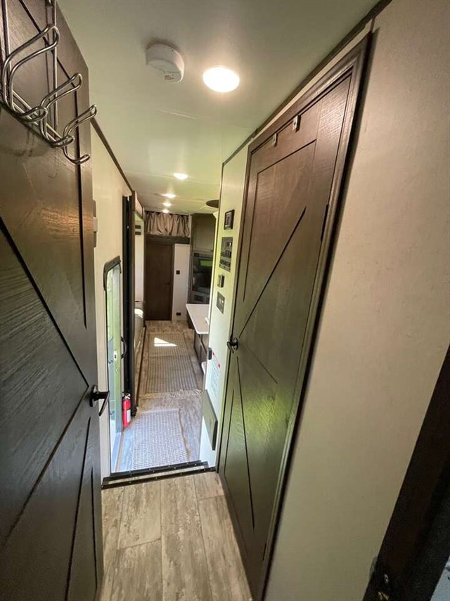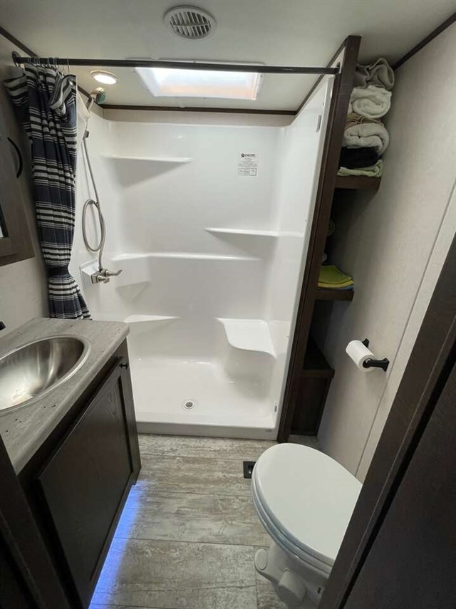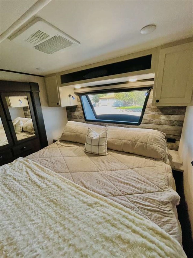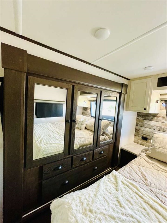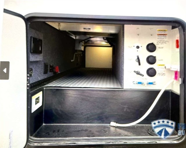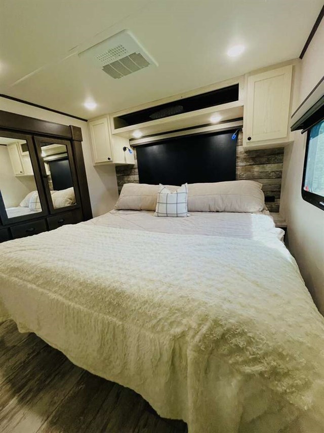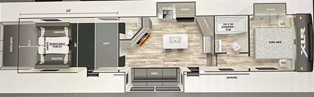 How does a 15' separate garage area with an electric queen bed including sofas and tables below, a side man door, a half bath and storage for your gear sound in your next toy hauler fifth wheel? Get ready for action, relaxation and everything else at your favorite campsite. You can easily set up the triple slide outs, unload your toys and enjoy the garage or the separate main living and kitchen area which includes two slides, a larger sofa, an electric fireplace with 50" TV above for entertainment, plus a kitchen island with seating. The cook will love the appliances including the pantry plus the residential refrigerator and microwave to keep everyone fed. You will have a full bathroom next to the private bedroom with a king-size bed and wardrobe slide plus more storage for all your things.