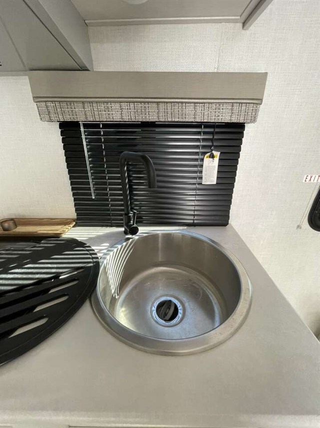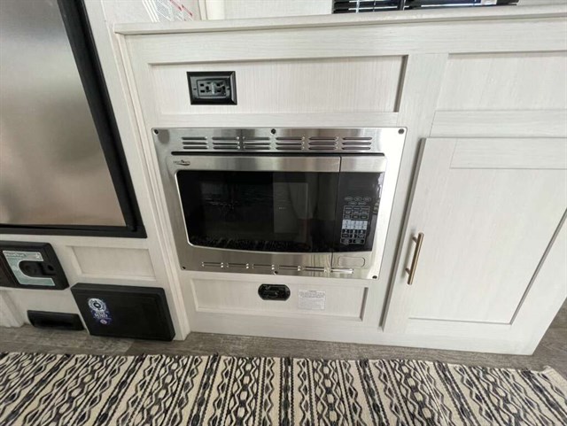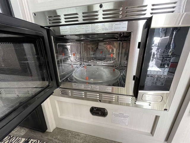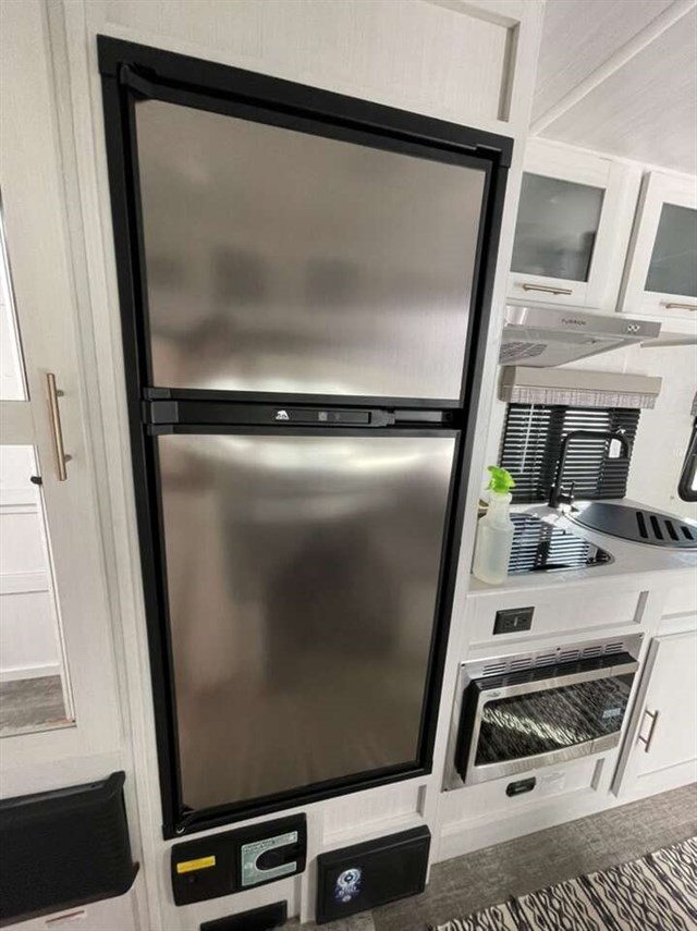 The well-appointed kitchen features a two-burner stovetop, microwave, sink, and refrigerator/freezer. Prepare your favorite meals on the road with ease.