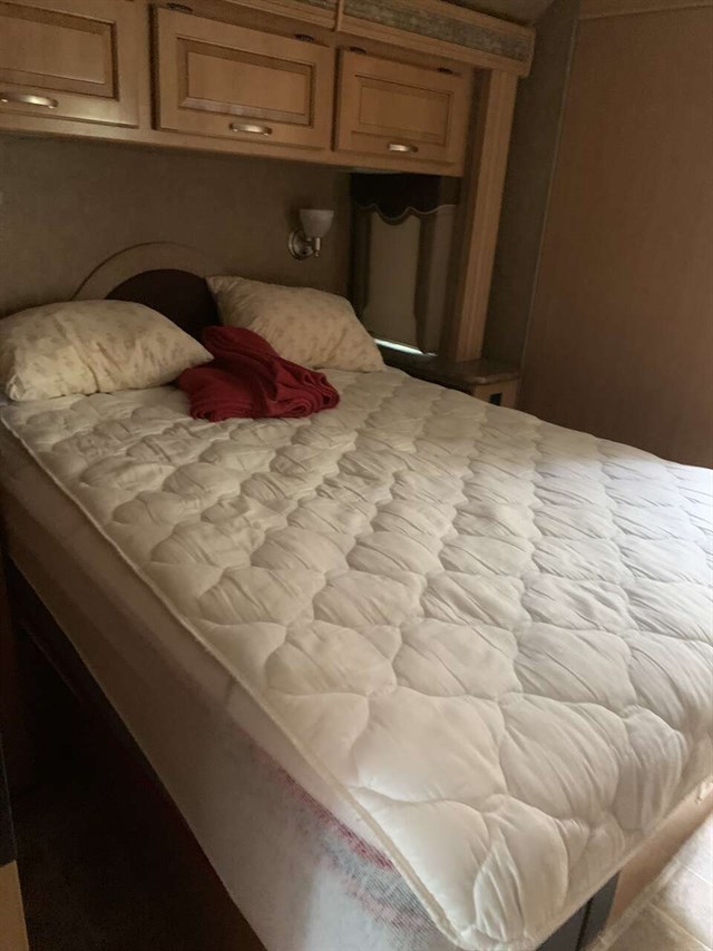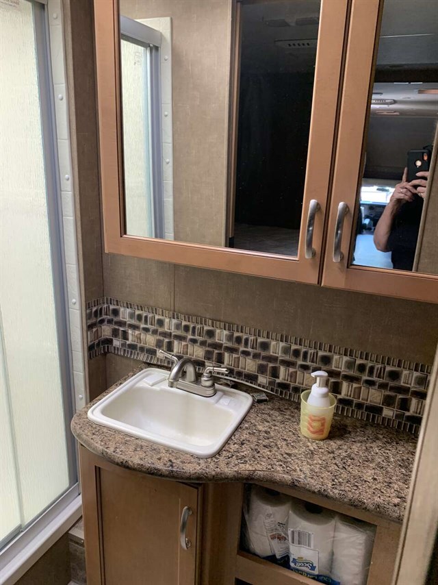 2015 Thor Motor Coach 35SF Super C model motor home with 2 slides. This unit is powered by the powerful 300 HP Powerstroke 6.7L diesel engine with 660 lb. ft. of torque. It rides on a Ford F-550 chassis with a 6-speed automatic transmission and boast a big 10,000 lb. hitch, rear pass-thru MEGA-Storage, extreme duty 4 wheel ABS disc brakes and an electronic brake controller integrated into the dash. Options include the beautiful full body paint exterior, cabover entertainment center with 50" TV & soundbar, power attic fan, dual child safety seat, an Onan diesel generator. The Chateau 35SF is approximately 36 feet in length and features a plush dinette and sofa, exterior entertainment center, dual roof air conditioners, power patio awning, one-touch automatic leveling system, residential refrigerator, 30 inch over the range microwave, solid surface countertop, touch screen AM/FM player, back-up monitor with side view cameras, remote heated exterior mirrors, power windows and locks, leatherette driver & passenger captain's chairs, fiberglass running boards, soft touch ceilings, heavy duty ball bearing drawer guides, bedroom LED TV, large LED TV in the living area, an 1800-watt power inverter, heated holding tanks and washer/dryer and oustside TV!