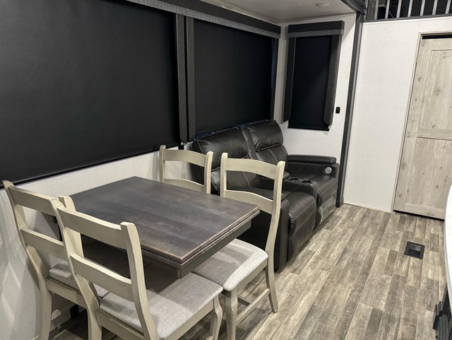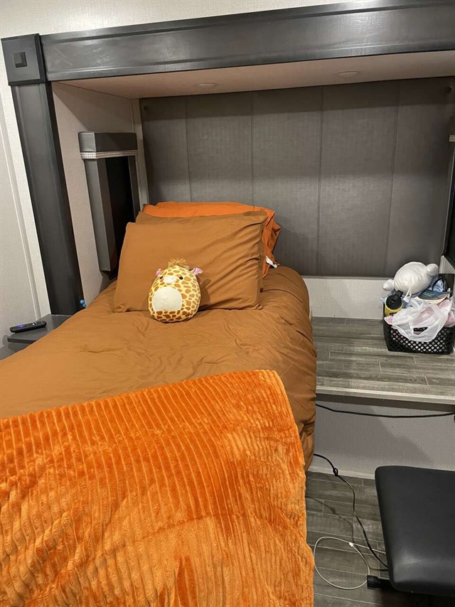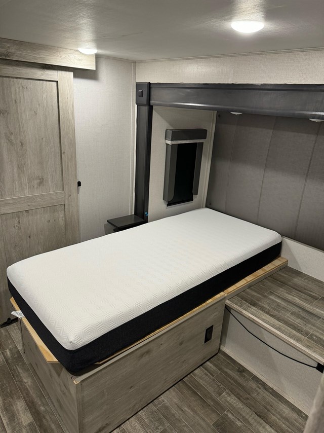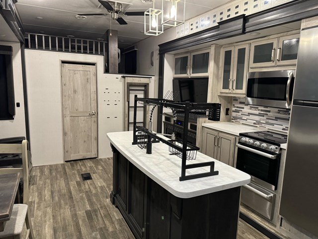 Get ready for family fun in this fifth wheel offering a front master bedroom with a king-size bed slide with upgraded Sleep Numbre mattress, plus a second master bedroom for your guests, modified to a twin size bed with a new Bear mattress for more space in the room, a loft above the bedroom, plus a rear full bathroom including a unique rear entry/exit door. And both entrances include the LCl SolidStep. The main living and kitchen area offers dual opposing slides and include theater seating, a free standing dinette, a fireplace, a center island and full kitchen amenities to feed the crew.
