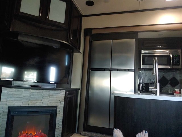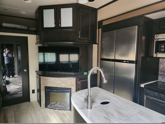 Step inside the main entry door and notice all the home like features with an entertainment center including a LED TV with fireplace below. There is also a pantry/linen straight ahead, a large slide out 4-seat sofa to the left of the main entry door with a stowable table for comfortable seating during mealtimes and more.