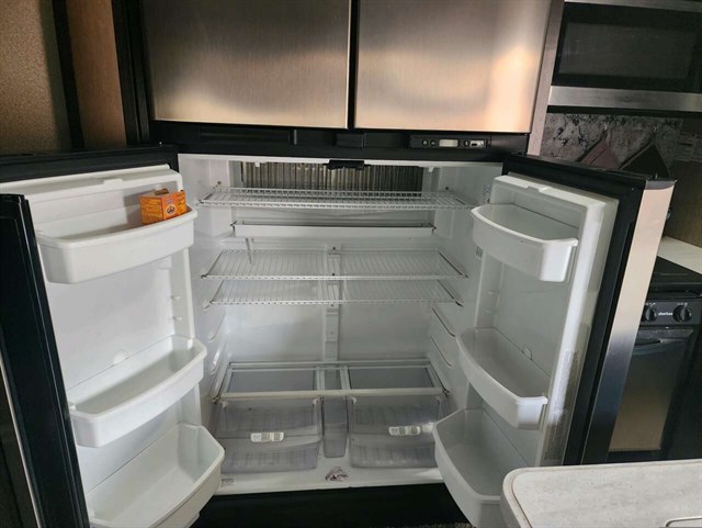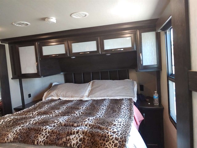 The kitchen offers all the amenities you need to enjoy spending time on the road. There is a slide out 18 cu. ft. refrigerator, three burner range with overhead microwave, and a counter peninsula along with a kitchen sink, and storage both above and below the counter.
