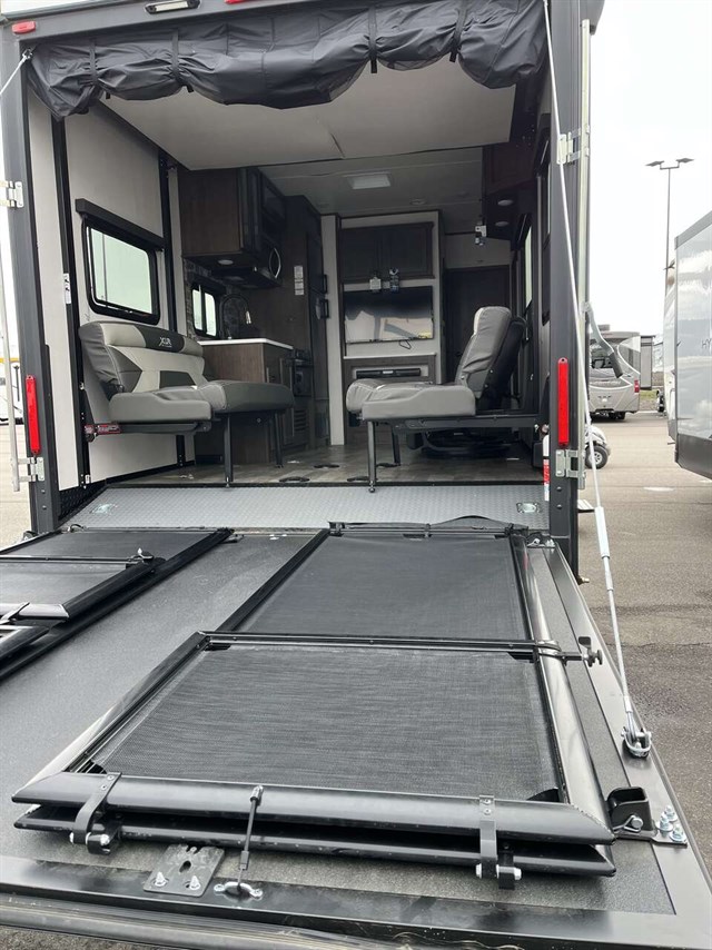This XLR Hyper Lite toy hauler has been awarded the "Travel Trailer Toy Hauler of the Year" from RV News, so you can trust that it is absolutely your best choice! There are excellent relaxation choices with the dual sofas and the two lounge chairs with end table in between, and for sleeping, the electric queen bunk above the sofas and the queen-size bed in the master suite will both be a delight to find. You can snuggle up with a good book and a blanket in front of the electric fireplace, and you can always stay clean by using the shower in the dual-entry bathroom. There is also a bathroom skylight so that you can have some added sunlight while you get ready.