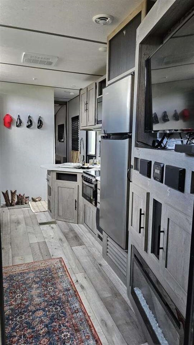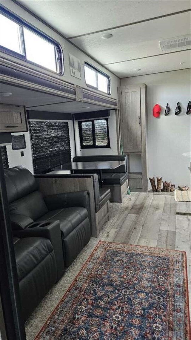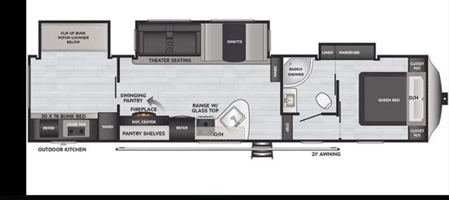 The trailer is 38 feet, it has 3 slide outs. Has a nice bunkroom in the back with two top bunks and a set of cushions that fold from a little couch into a bed or into a fort for kids. And it Has an outdoor kitchen. Im including the 5th wheel hitch that comes with it as well as slide out supports that I bought and a fifth wheel hitch stand that goes on the front for better stability.