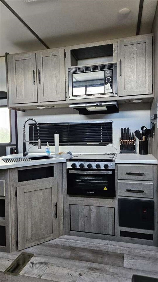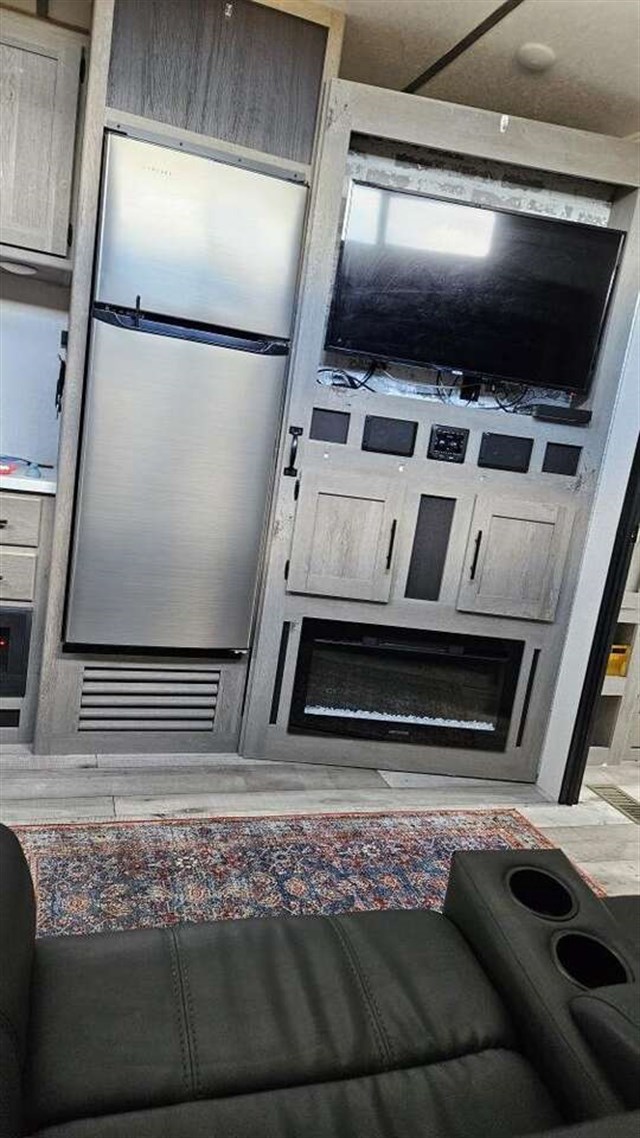 The whole gang will love camping in this Keystone Springdale fifth wheel! The rear private bunkhouse features a 30" x 76" bunk bed next to a wardrobe and a flip-up bunk above a fun lounger. The living area will have you feeling right at home with theater seating across from the entertainment center with a fireplace and a swinging pantry that has shelves. After you have prepared a delicious dinner at the range with glass top, you can head to the booth dinette and enjoy it there comfortably then play a card game or two. You could even cook at the outdoor kitchen which has a refrigerator to keep your beverage cold while you cook too. The dual-entry bathroom makes it easy for everyone to access, especially those staying in the front private bedroom!