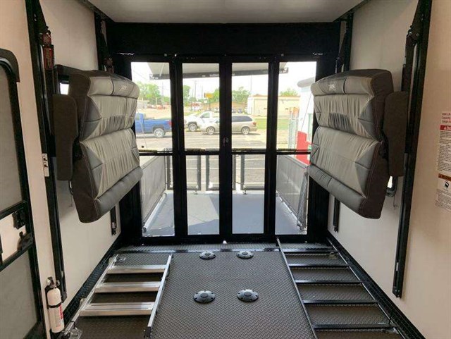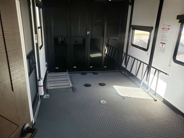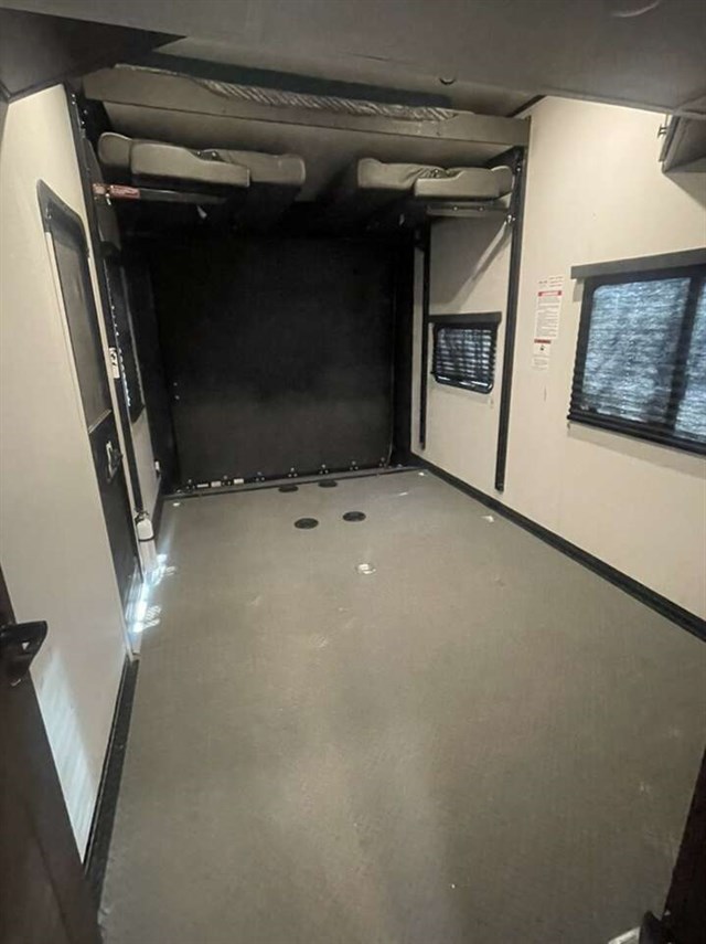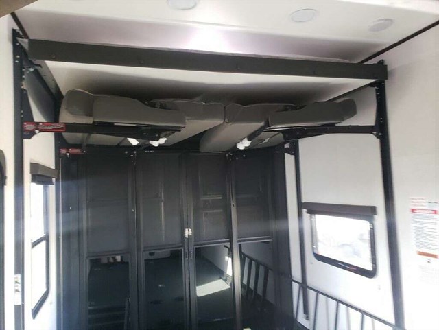Load up your toys into the 15' garage area of this toy hauler with the spring assisted ramp door! The garage also has a set of opposing sofas with a table in between, a bed above them, a loft, and a half bathroom, plus one of the dual entry doors to the unit. You can easily load and unload your toys with the insulated weather proof ramp door, plus the garage has a retractable panoramic screen to bring in natural lighting without the bugs.