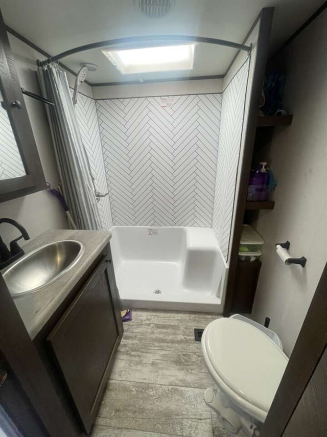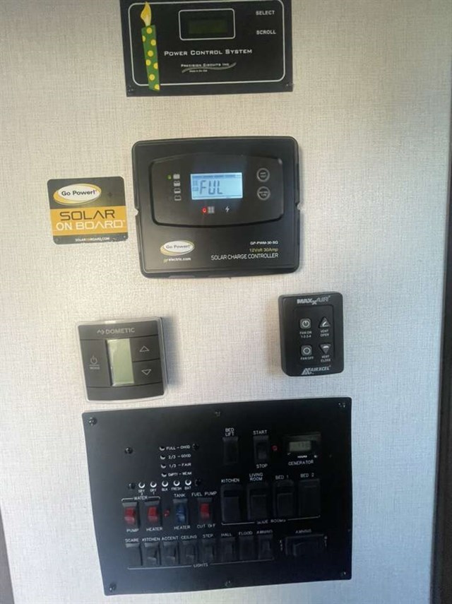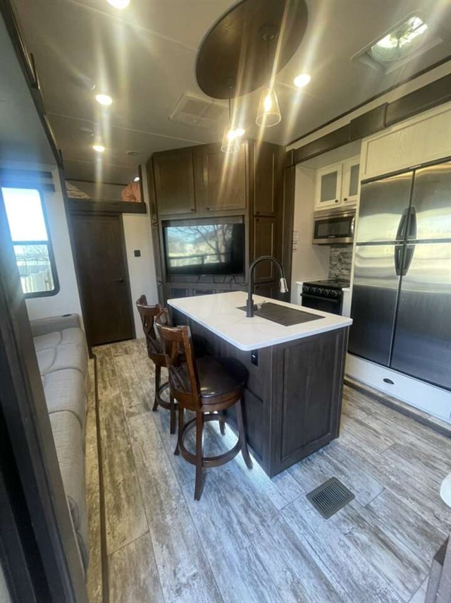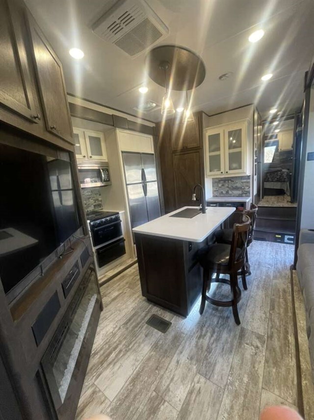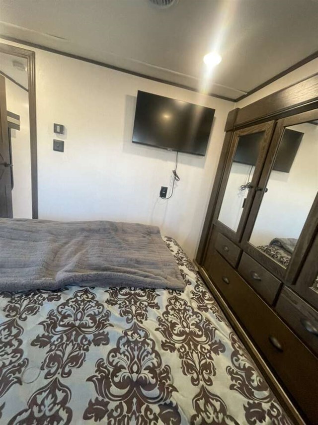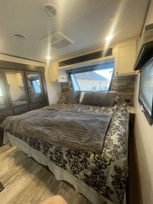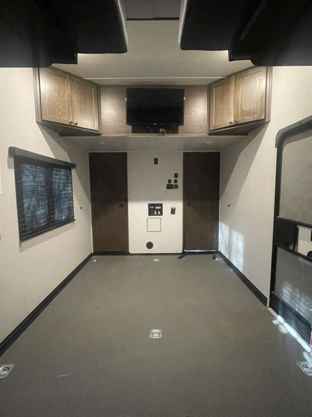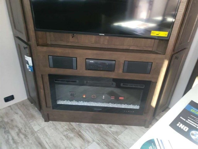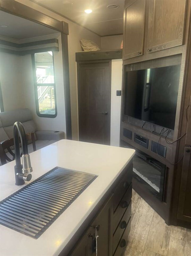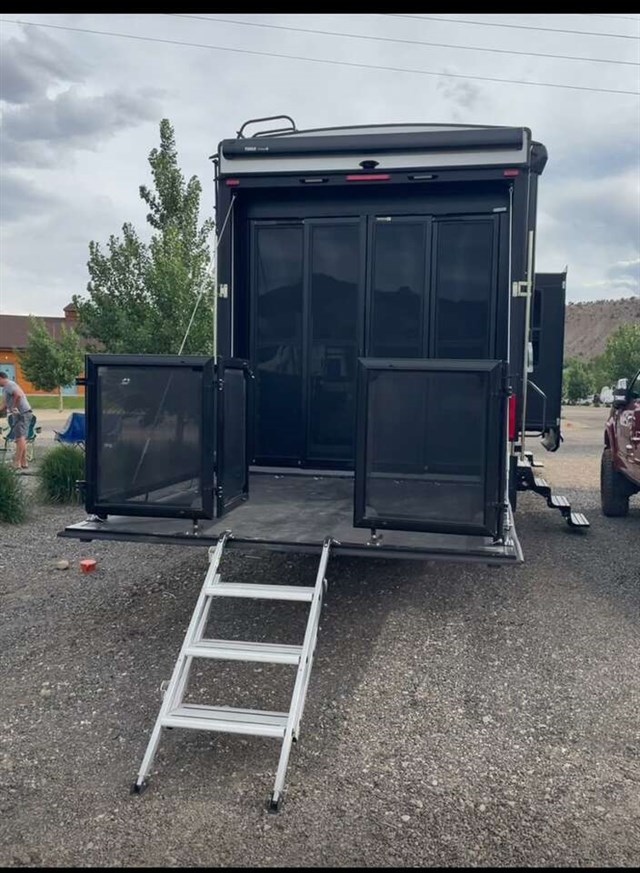 TRIPLE SLIDE FIFTH WHEEL TOY HAULER W/ 1/2 BATHS, 5500 YAMAHA GENERATOR, 6 POINT AUTO LEVELING, THREE A/C UNITS, THREE SAMSUNG TVS, RESIDENTIAL REFRIGERATOR, THREE AWNINGS, UPGRADED SEMI STEER TIRES, SOLAR PANELS, AND FIREPLACE.
