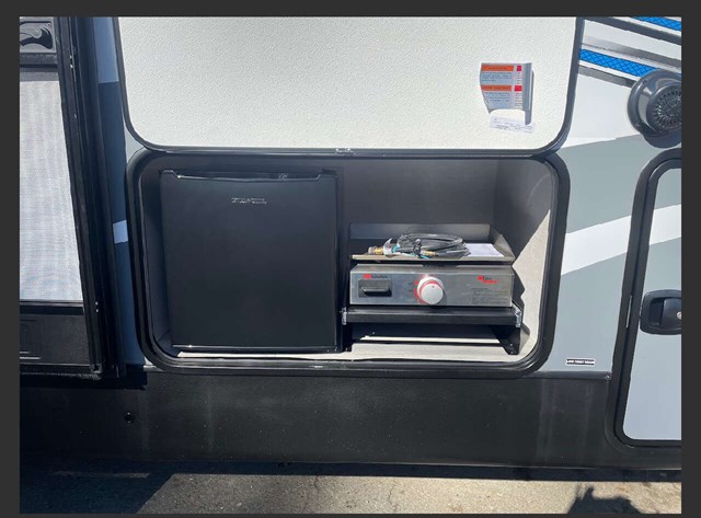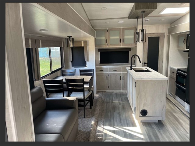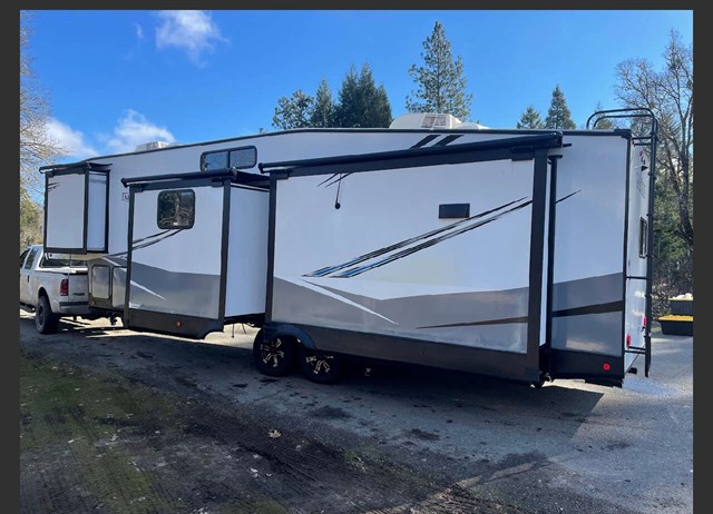 This is a brand new trailer. We bought it new with the intention of living in it, but due to unexpected life circumstances we never got that far. This is a very clean, very spacious trailer. It has two bedrooms, one bathroom, and a loft. There are four slide outs with special topper covers for all of the slide outs. It has a good sized bathroom and shower. The trailer has an on-demand water heater installed. There are dual batteries installed in the front compartment as well. The trailer currently has on board solar, with the option of adding additional panels later. There’s an outdoor kitchen set-up, as well as outdoor lighting, and speakers. There's covers for all 4 pop-outs. There’s space in the main bedroom for a washer/dryer. There’s places to hang a TV in both bedrooms. The same model new goes for $87,000. We have an Anderson Hitch Gooseneck conversion we’ll throw in with the trailer. It makes it really simple to load up and go.