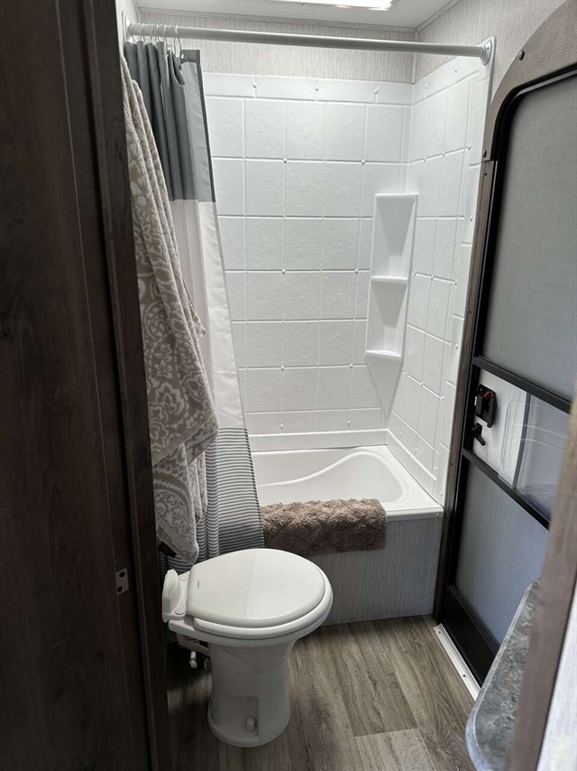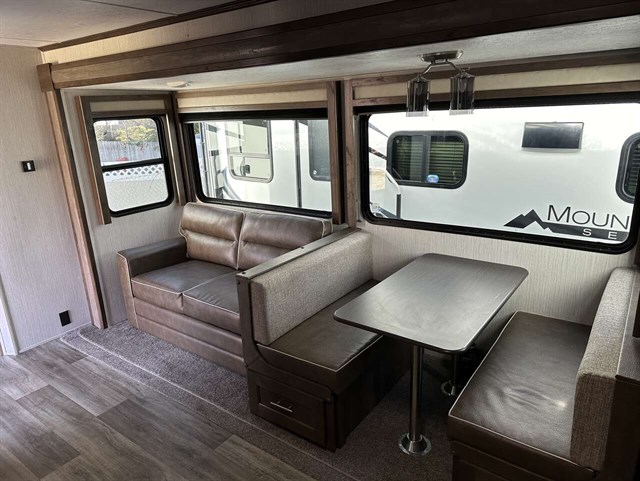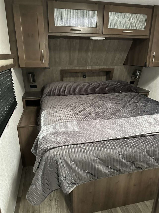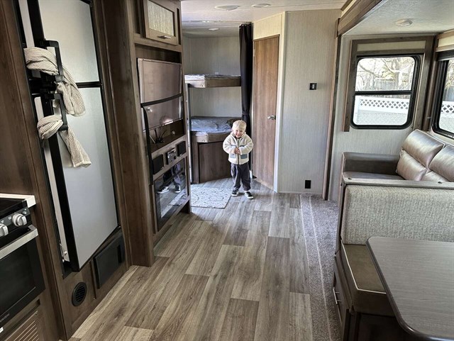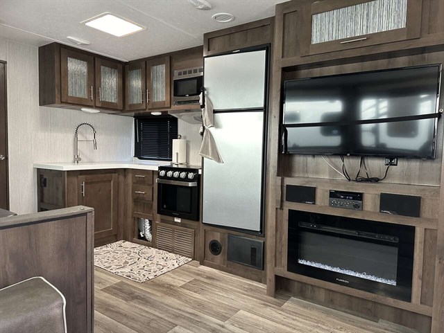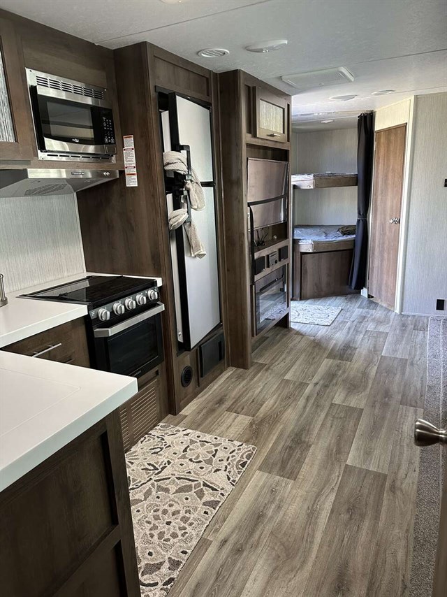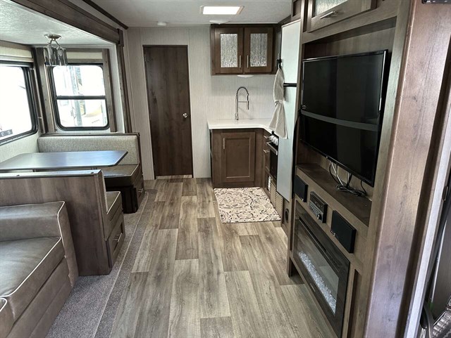 Your kids will be begging you to go camping in this travel trailer! They will love sleeping on the rear double bunk beds with a ladder for them to safely reach the top bunk. Plus, there is a tri-fold sofa and booth dinette that can transform into extra sleeping spaces so they can bring along a friend or two too. The walk-in pantry is big enough to hold all of their favorite snacks so you won't have to worry about them going hungry either. Includes a fireplace and entertainment center.