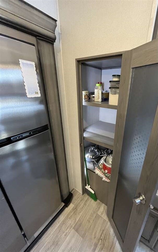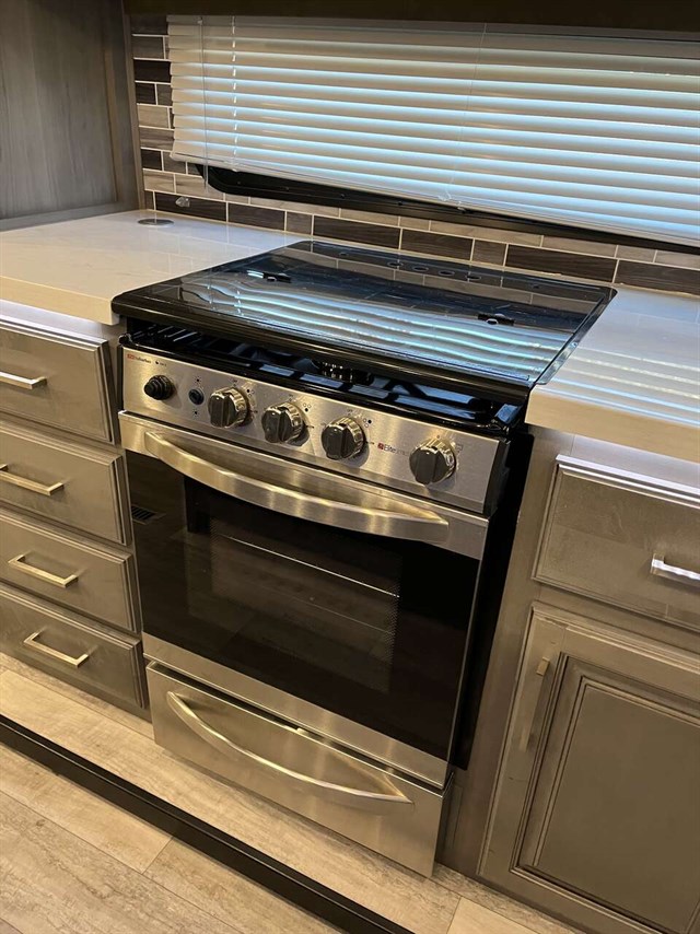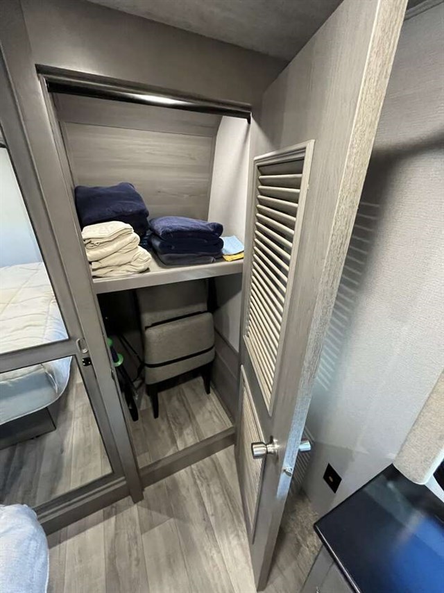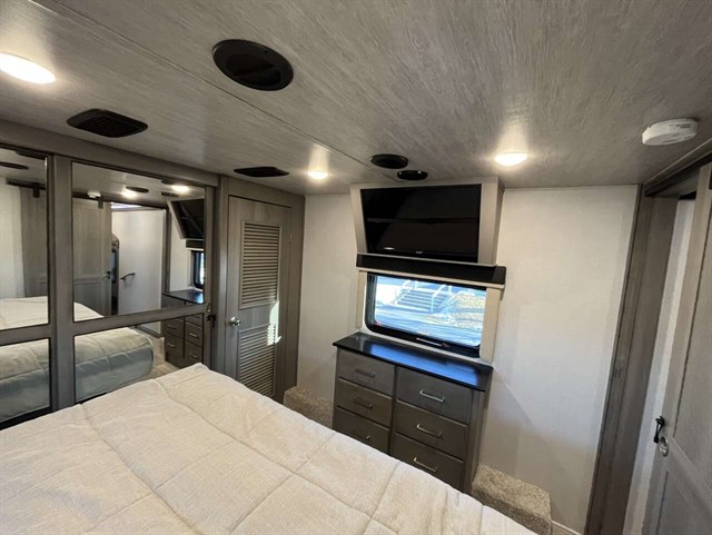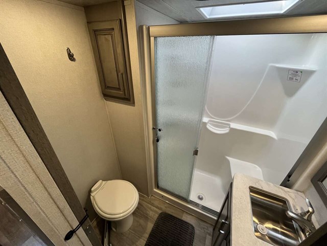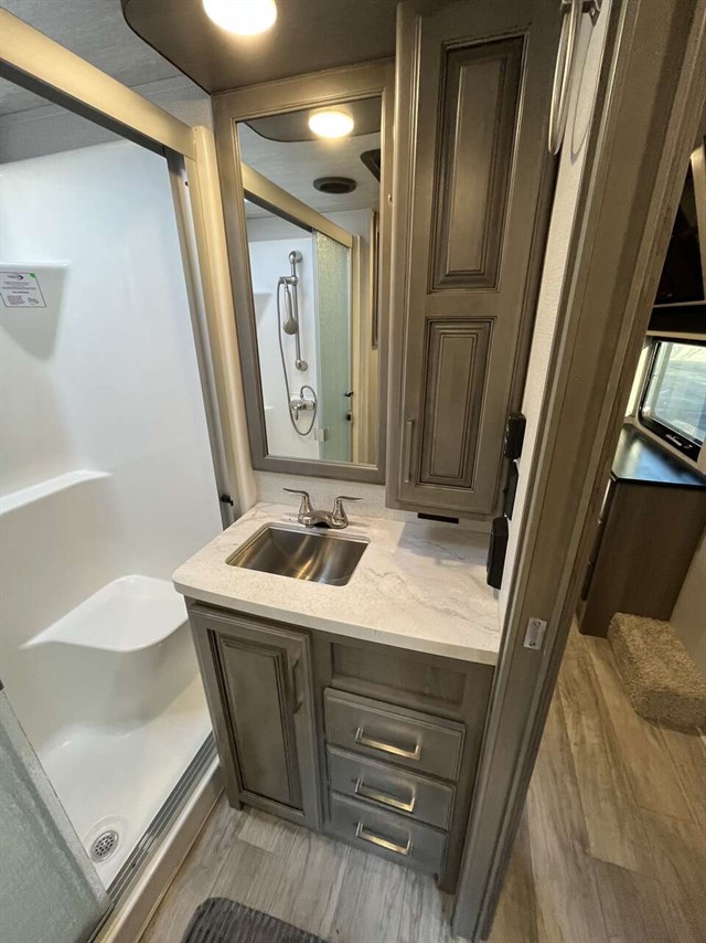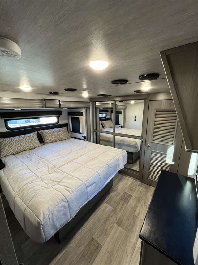 Step inside to discover a spacious and well-appointed interior, featuring upscale furnishings and modern amenities. The kitchen is perfect for preparing meals on the go, while the cozy living area provides a relaxing space to unwind after a day of exploration. And when it's time to rest, retire to the master bedroom boasting a luxurious king-sized bed, ensuring a peaceful night's sleep wherever you park.