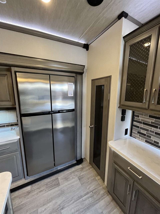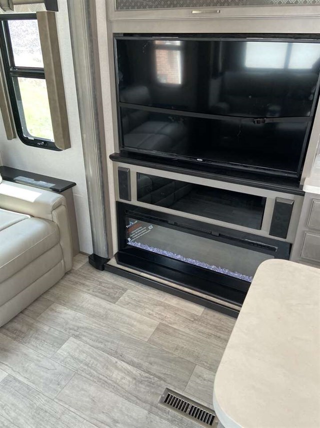 But that's not all - this Montana also offers the convenience of washer and dryer hookups, allowing you to keep your wardrobe fresh and clean on the road. Plus, enjoy entertainment options with two flat-screen satellite TVs and a small fireplace, creating a cozy atmosphere for relaxing evenings indoors.