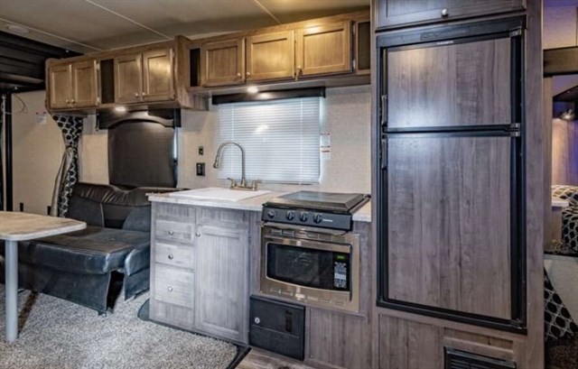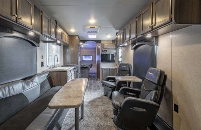This RV is approximately 31 feet in length and features stabilizers, A/C, 4KW Onan gas generator, aluminum wheels, water heater, power patio awning, black tank rinsing system, water filtration system, exterior shower, booth converts to sleeper, black-out shades, sink covers, convection microwave, 3 burner range, foam mattress, flat panel TV.