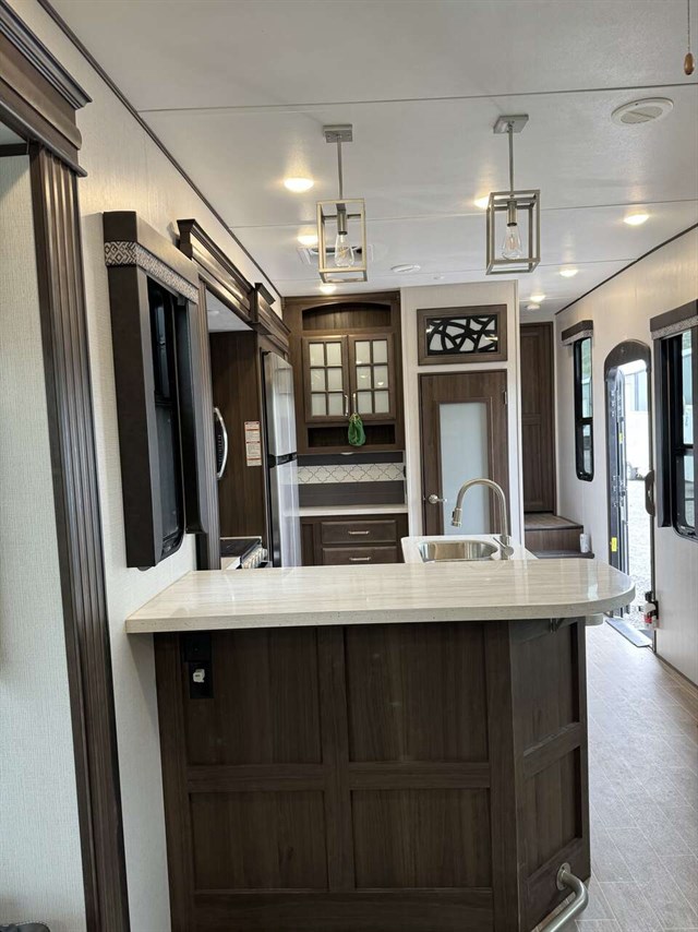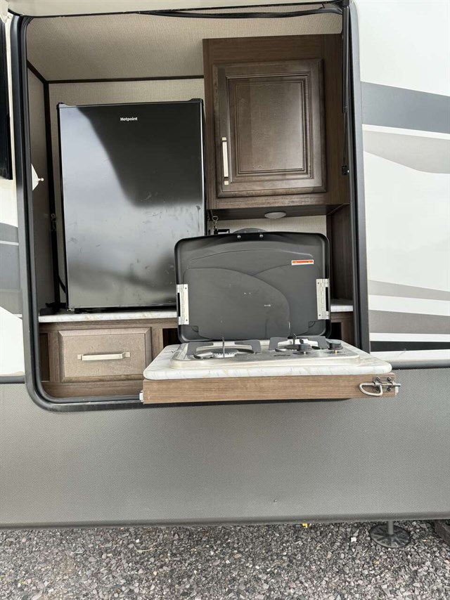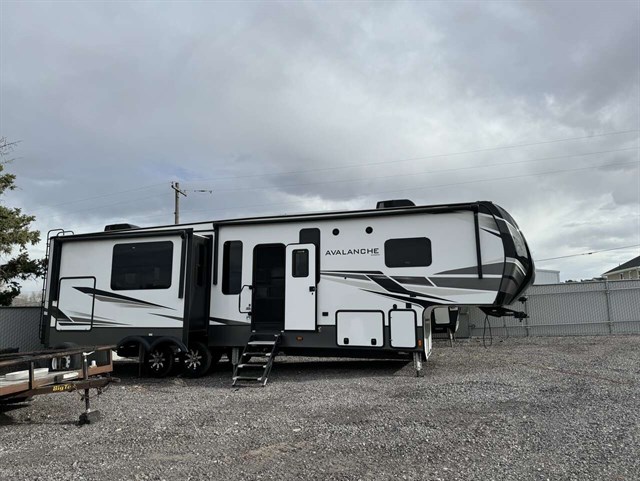 With any Keystone Avalanche fifth wheel, you will enjoy getting to your favorite destination with the exceptional turning radius from the MAX TURN high-gloss fiberglass front cap, as well as the Road Armor suspension. Once you have arrived at your destination, the One Place Command Center with its centrally located operational switches and gauges will allow you to set up your RV quickly, and the one-touch electric awning with adjustable arms will provide protection from the sun and weather while you load your clothing, dishes, and gear into all of the interior storage compartments.