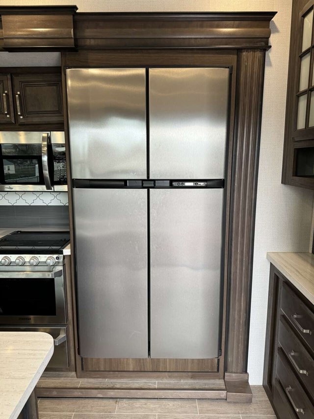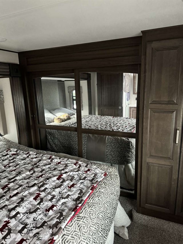 Very good condition just like new I've only camped in it 4 times bought it brand new and its been kept in a shop sense I bought it' I added soler to it and the bigger batteries it has 4 slides outs and a outdoor cooking stove and a fridge and has auto leveling and 2 air conditioner units and the bigger 2 door fridge inside big pantry and washer and dryer hook ups.