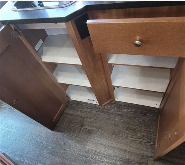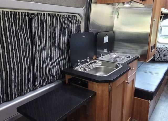• 5.5 cubic foot Norcold refrigerator, a two burner Dometic propane stove, Danby microwave, sink, pullout pantry, drawers and cabinets.