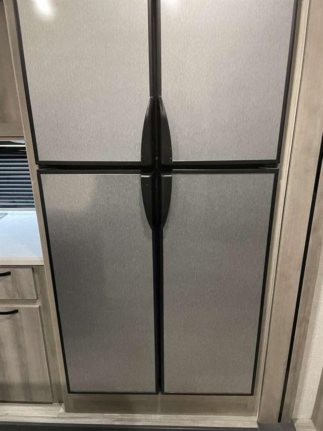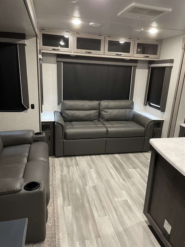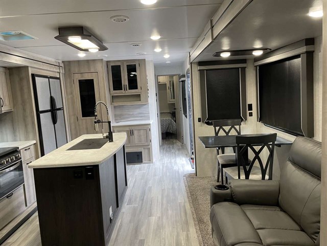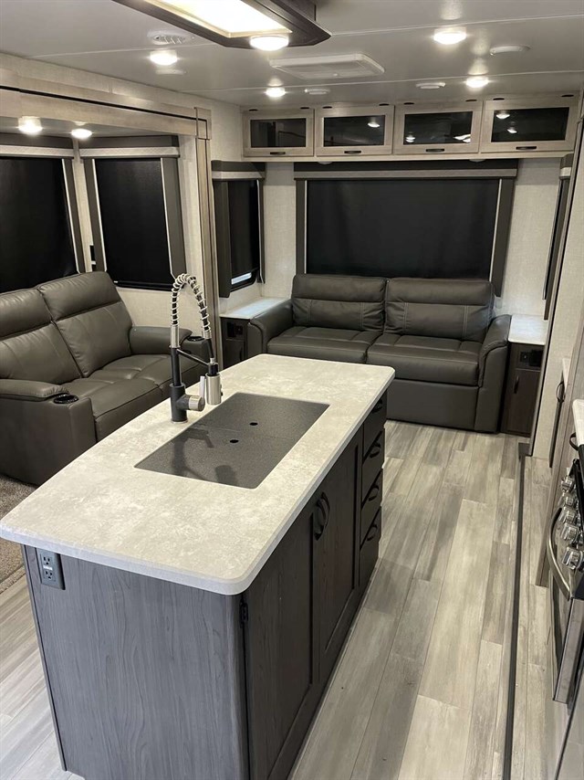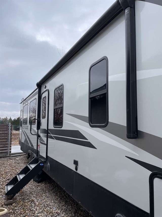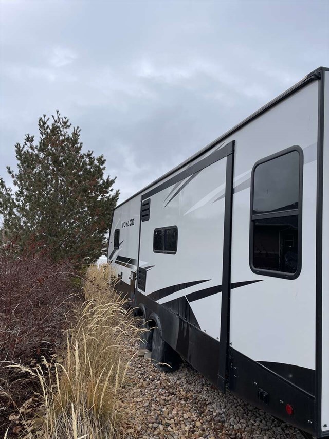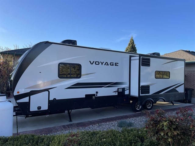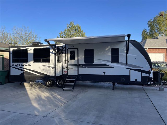 If the great outdoors is calling your name, but you don't want to sacrifice at-home comforts, choose this Voyage travel trailer and you won't be disappointed. The dual opposing slides in the rear living/kitchen area open up the whole space so that the kids can play on the floor, and the chef of the family will have plenty of space at the kitchen island to prep dinner. You'll appreciate plenty of storage, including a hutch and two pantries for all the dry goods and snacks. The full bath includes a space-saving sliding door and a large shower skylight so that you can clean up from your day of hiking or biking. This trailer also includes theater seating that sits directly across from the LED TV and a tri-fold sofa can be converted into sleeping space for the kids or your guests!