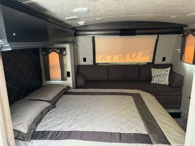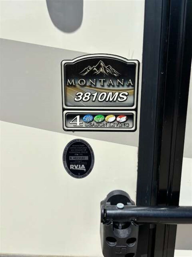 You are going to love the master suite in this Keystone Montana fifth wheel model 3810MS! With triple slide outs, a window lounge up front, and all of the necessities plus some, this can truly be your luxury home-away-from-home! The master suite features a unique front window lounge with storage underneath, a walk-in closet between the bedroom and bathroom including a washer/dryer prepped space, and access to the bathroom. The combined rear living and kitchen area allows you to make meals, visit with family, and relax while watching the HDTV all while being comfortable on the furniture with the warmth of the fireplace. The kitchen features a center island, an RV refrigerator, convection microwave, a hutch, and a pantry, plus more. Outside you can watch the 32" HDTV and entertainment center, relax under one of the two awnings and enjoy the fact that you own a Montana.