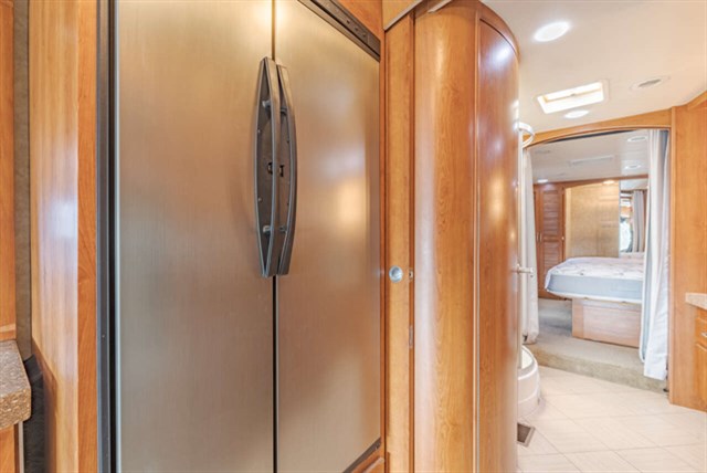 The kitchen has solid surface countertops, three burner stove, a dual basin sink, a microwave/convection oven, and a Dometic two-door refrigerator/freezer with an icemaker. There is a pantry.