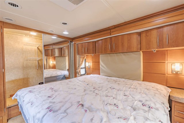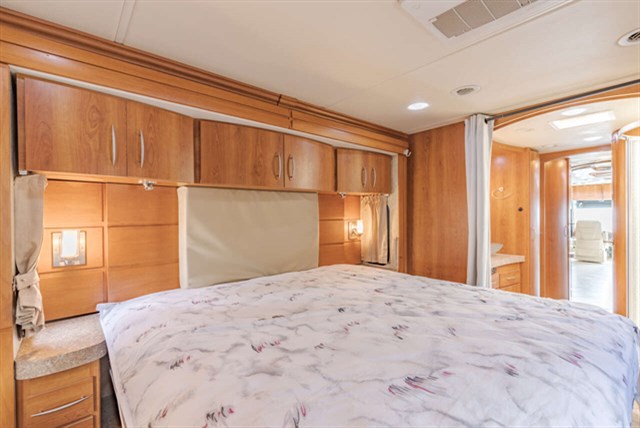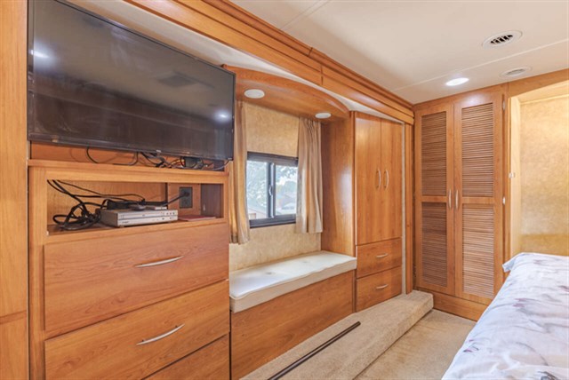 The rear master suite has a king bed, flat screen, hanging clothes closet, storage and this luxury coach has much more!